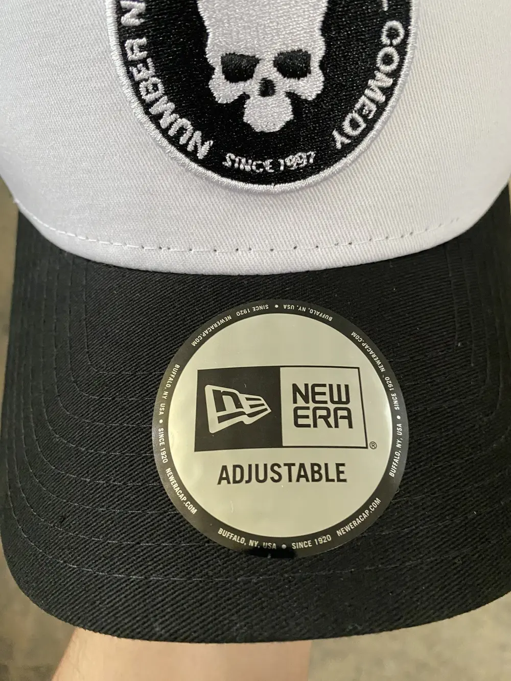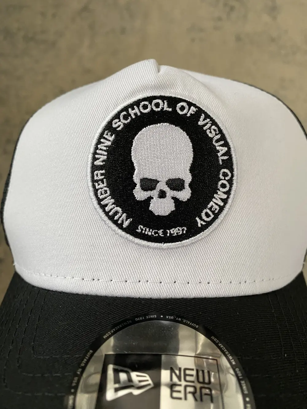 Trucker-style cap with white paneled front and black mesh back. Features 1997 skull embroidery with “School of Visual Comedy” text—an early Number (N)ine motif blending punk iconography with ironic academia. New Era logo stitched on the side; Number (N)ine shield embroidered at rear. Adjustable snapback closure.