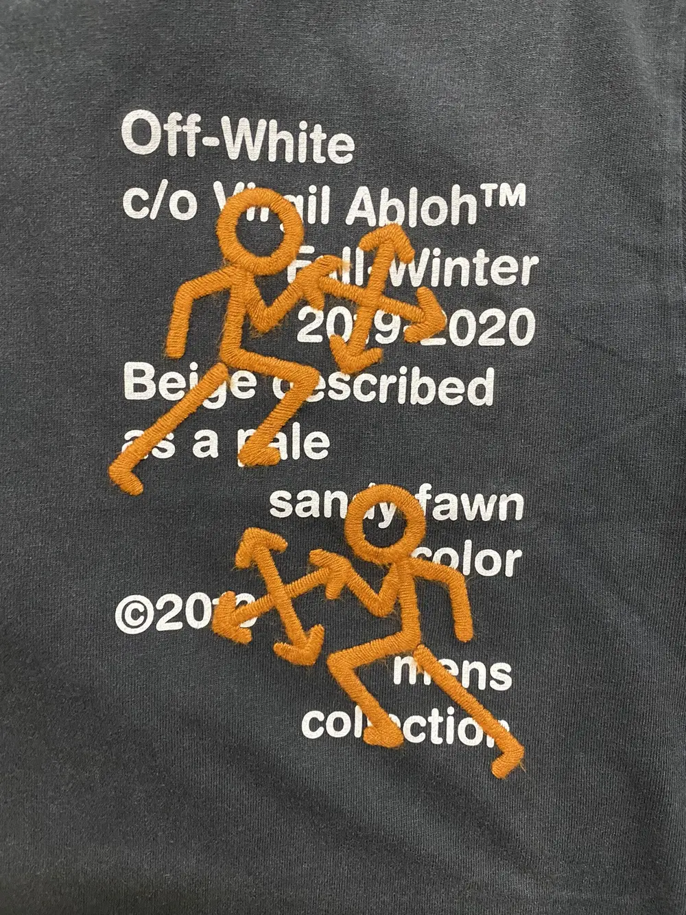 White AW19-20 Stickman TeeVirgil Abloh founded Off-White in 2012 and quickly became one of the most recognizable streetwear brands in the world due to its simple and self-referencing typography that often included the name of the garment in “quotations”. Off-White graphics feel like they can be made by a freshman graphics design student, yet the price-point of a t-shirt can be upwards of $300. Virgil once stated that his designs and prices are meant to be ironic. The intent of Off-White is to look at a piece and inspire you to start your own brand or pursue your own passion. RIP Virgil 🐐