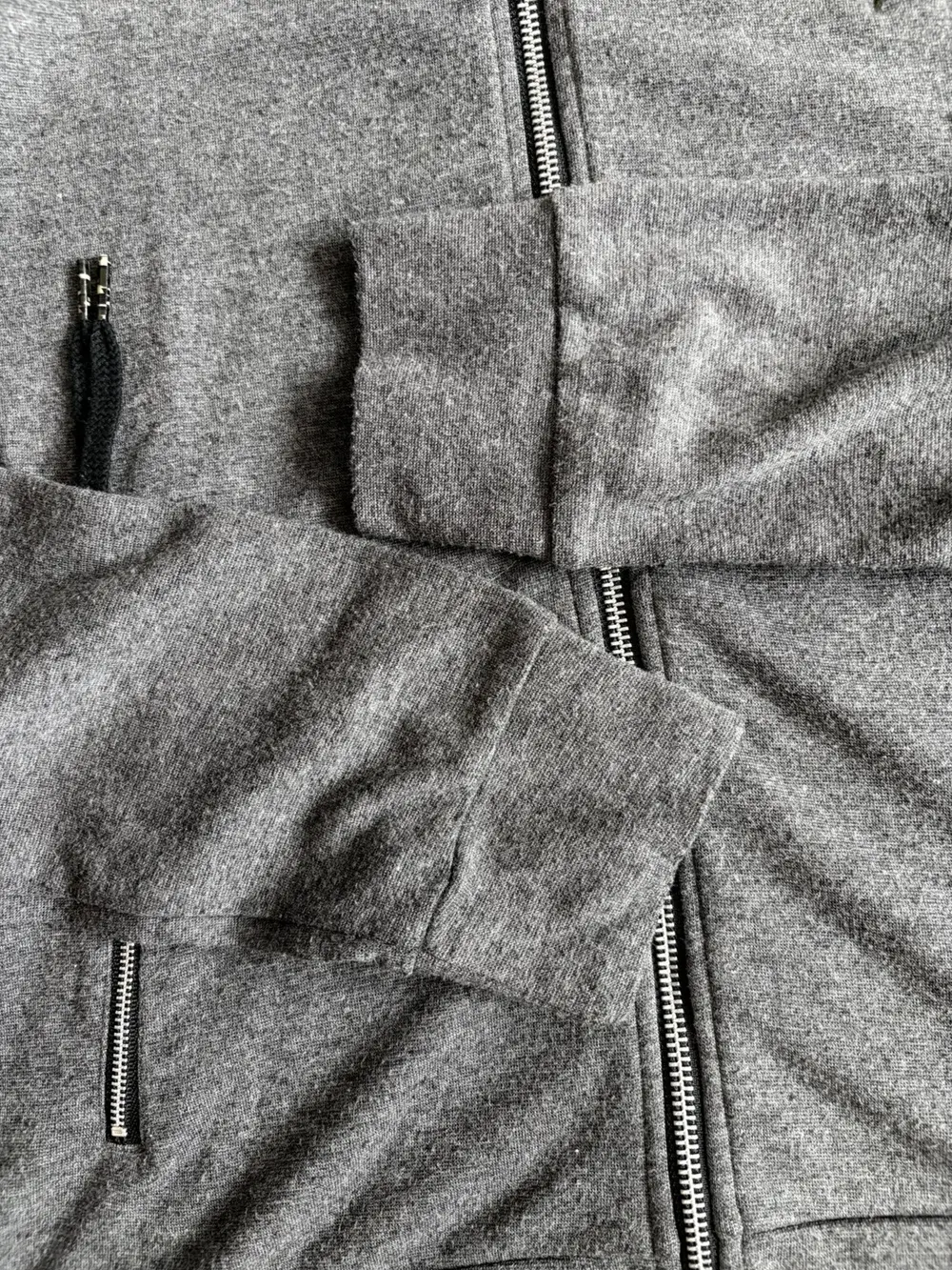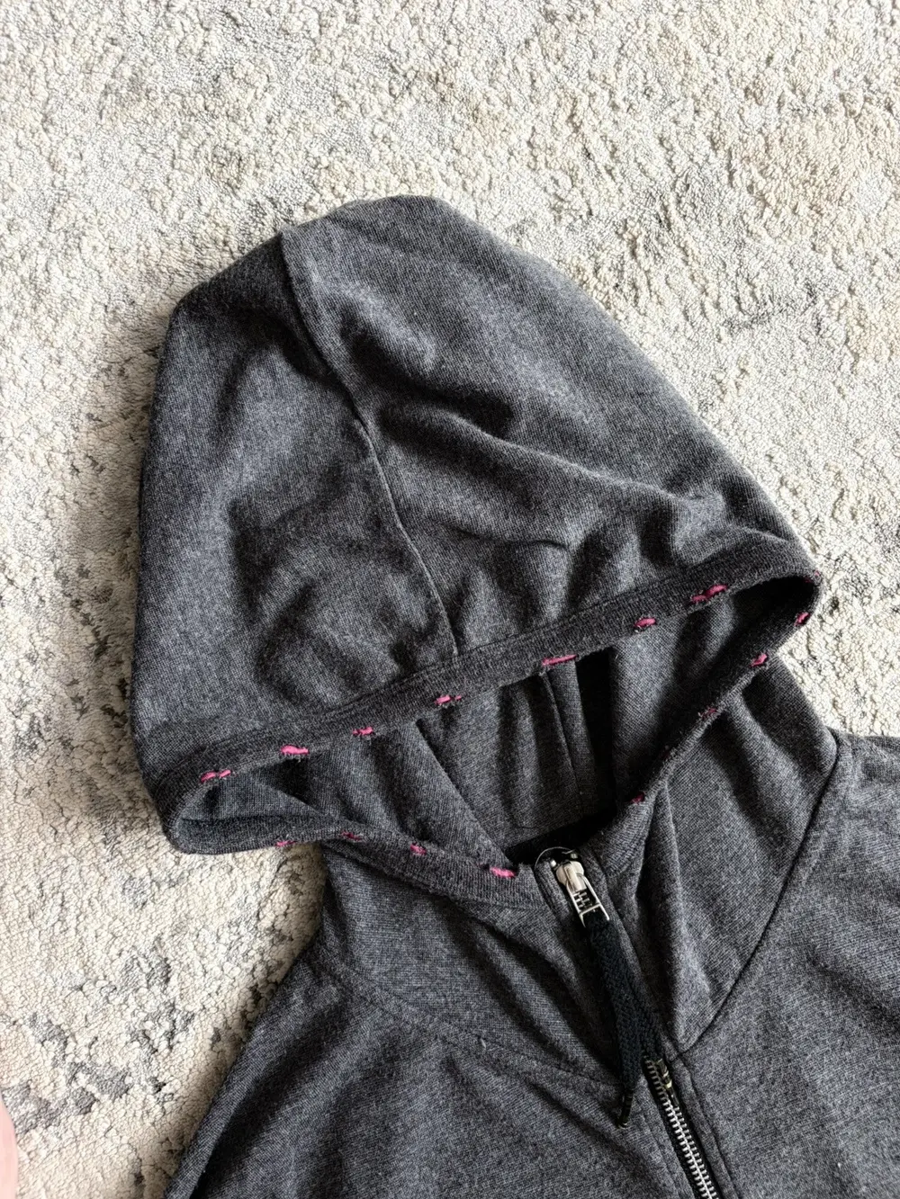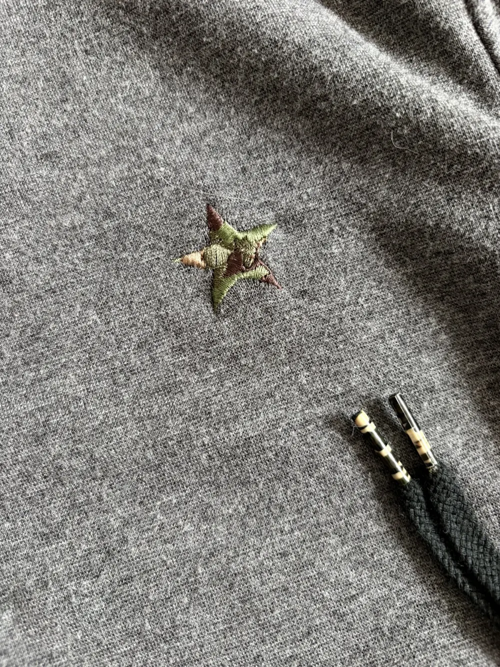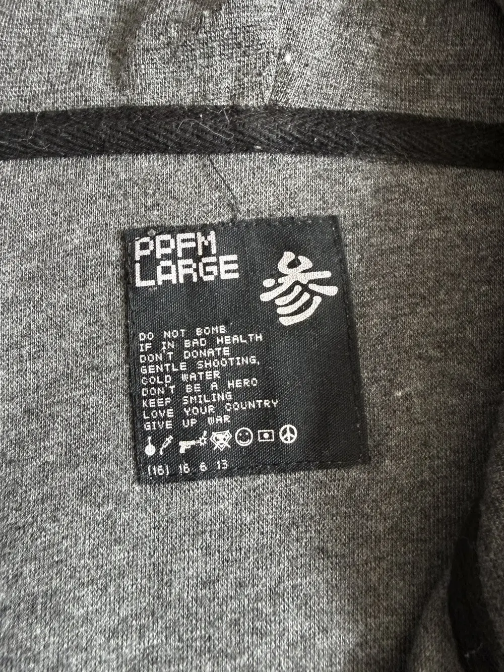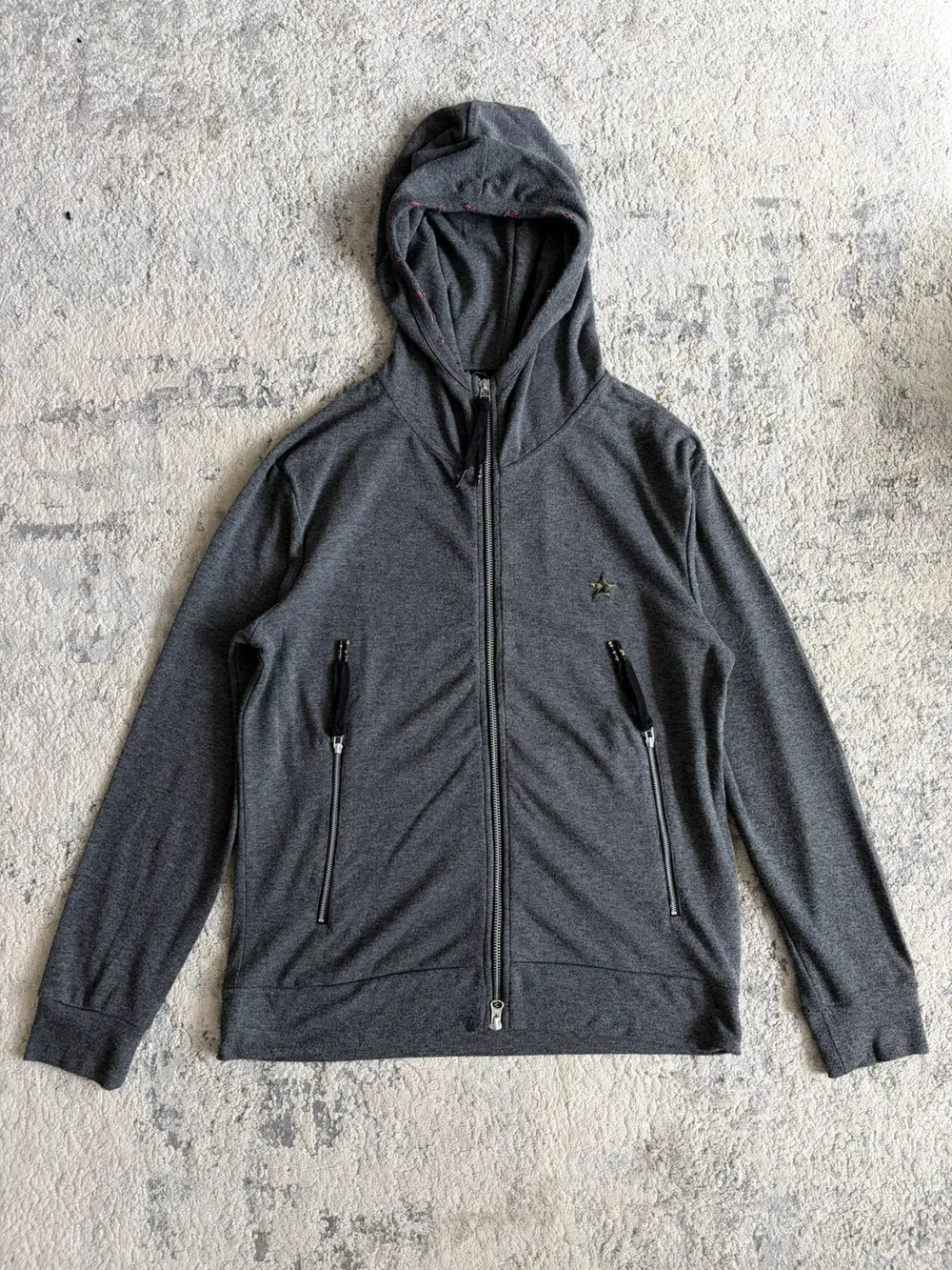 PPFM grey cotton hoodie featuring a camo star embroidery on the front and a distressed hood with pink elastic exposed along the edges. Built with double zippers and a high neckline that gives it a tech‑y, early‑2000s silhouette. Slim‑fitting Y2K cut