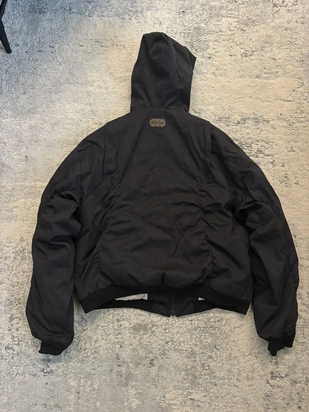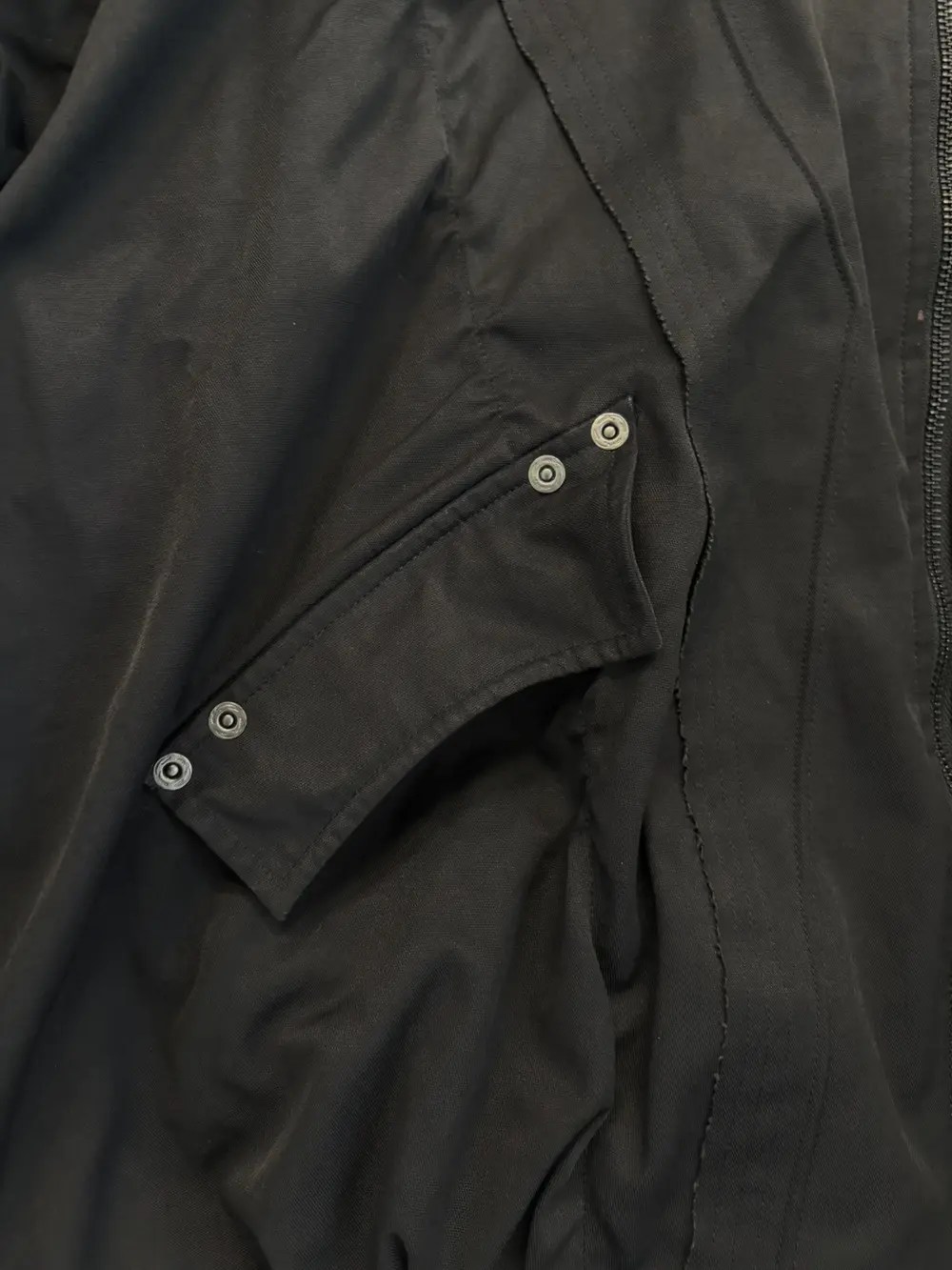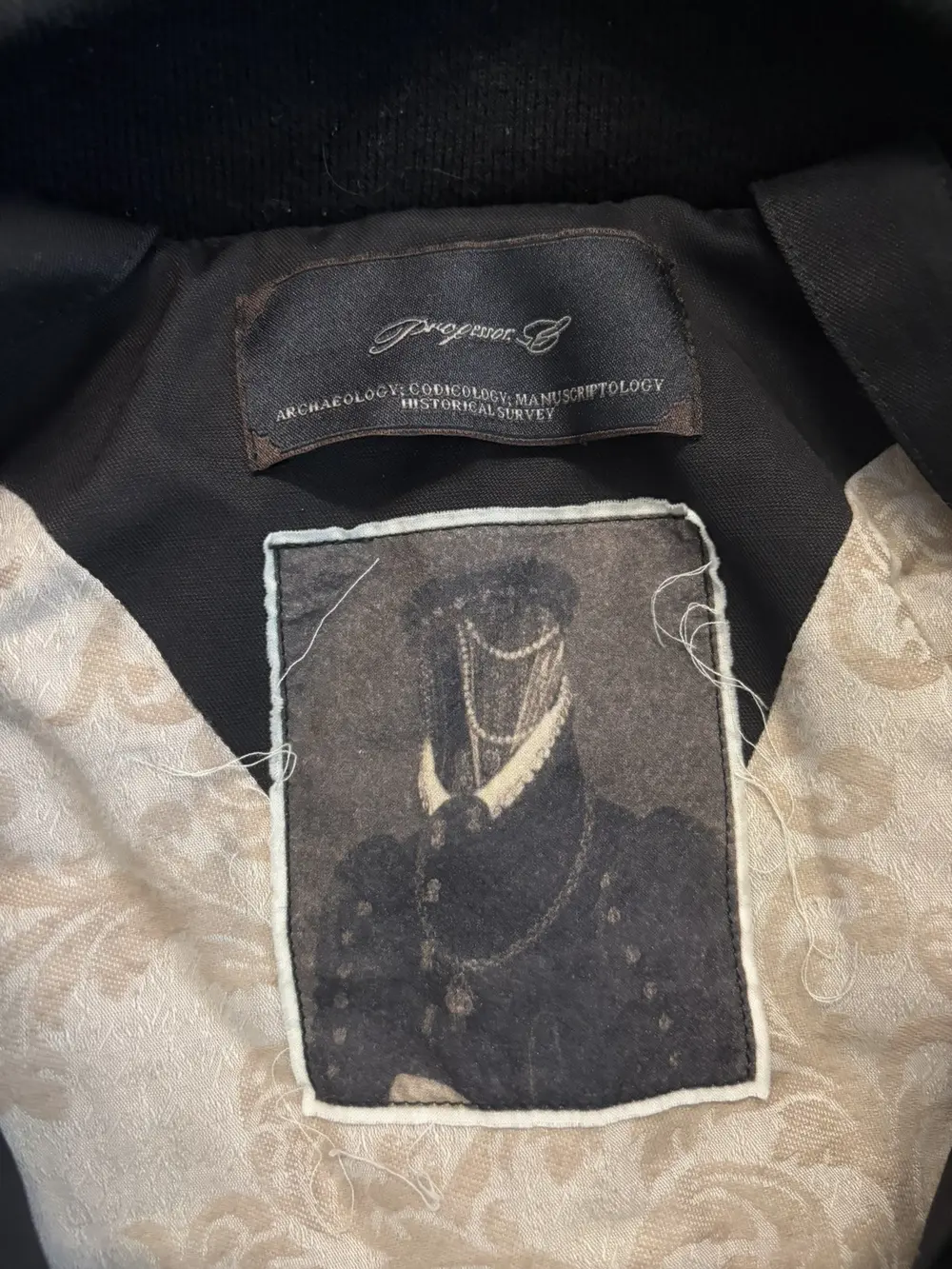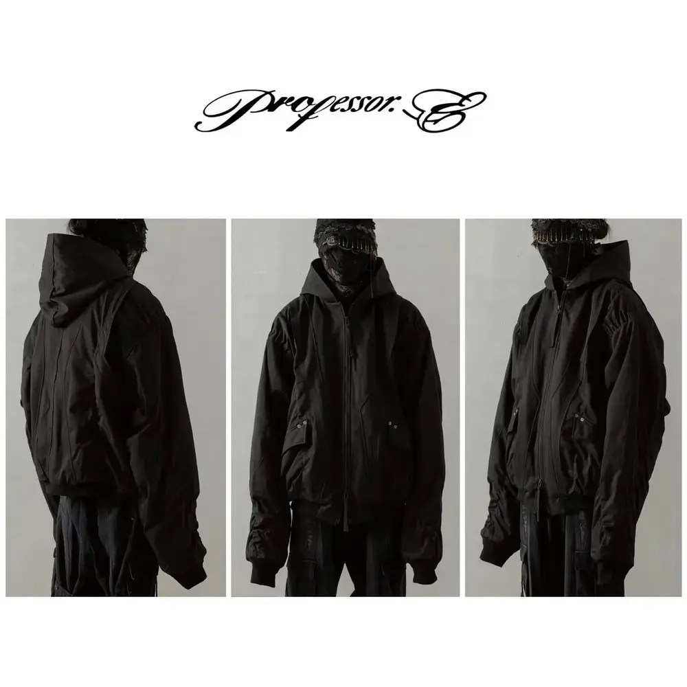 Professor.E oversized bomber cut with exaggerated sleeves and a dropped, rounded silhouette. Built from a heavy cotton‑poly blend that holds its shape and shows the geometric seamwork across the body. Fully lined with a contrast floral interior and equipped with internal backpack straps for off‑shoulder carry