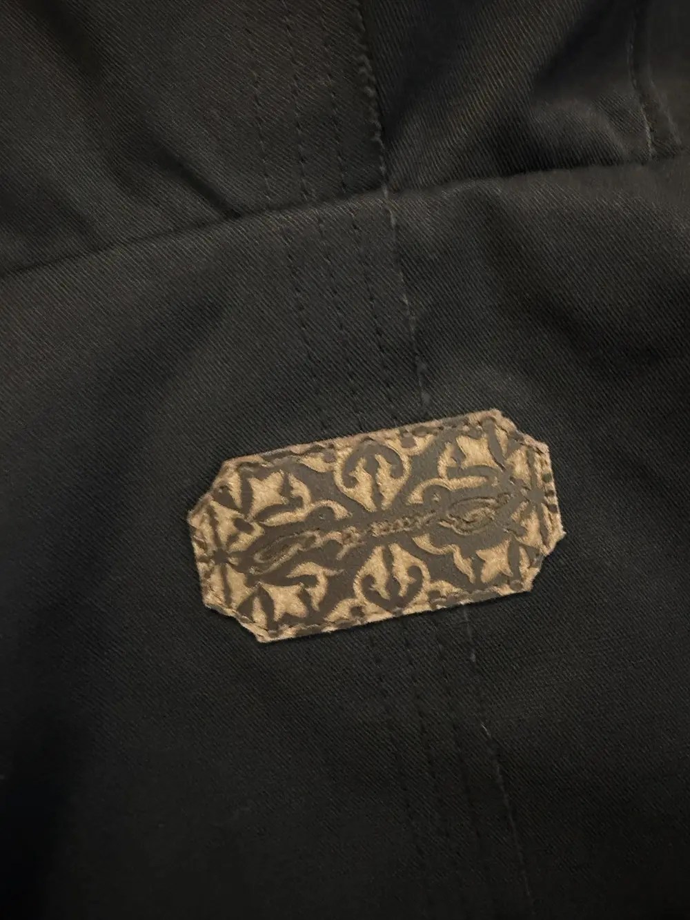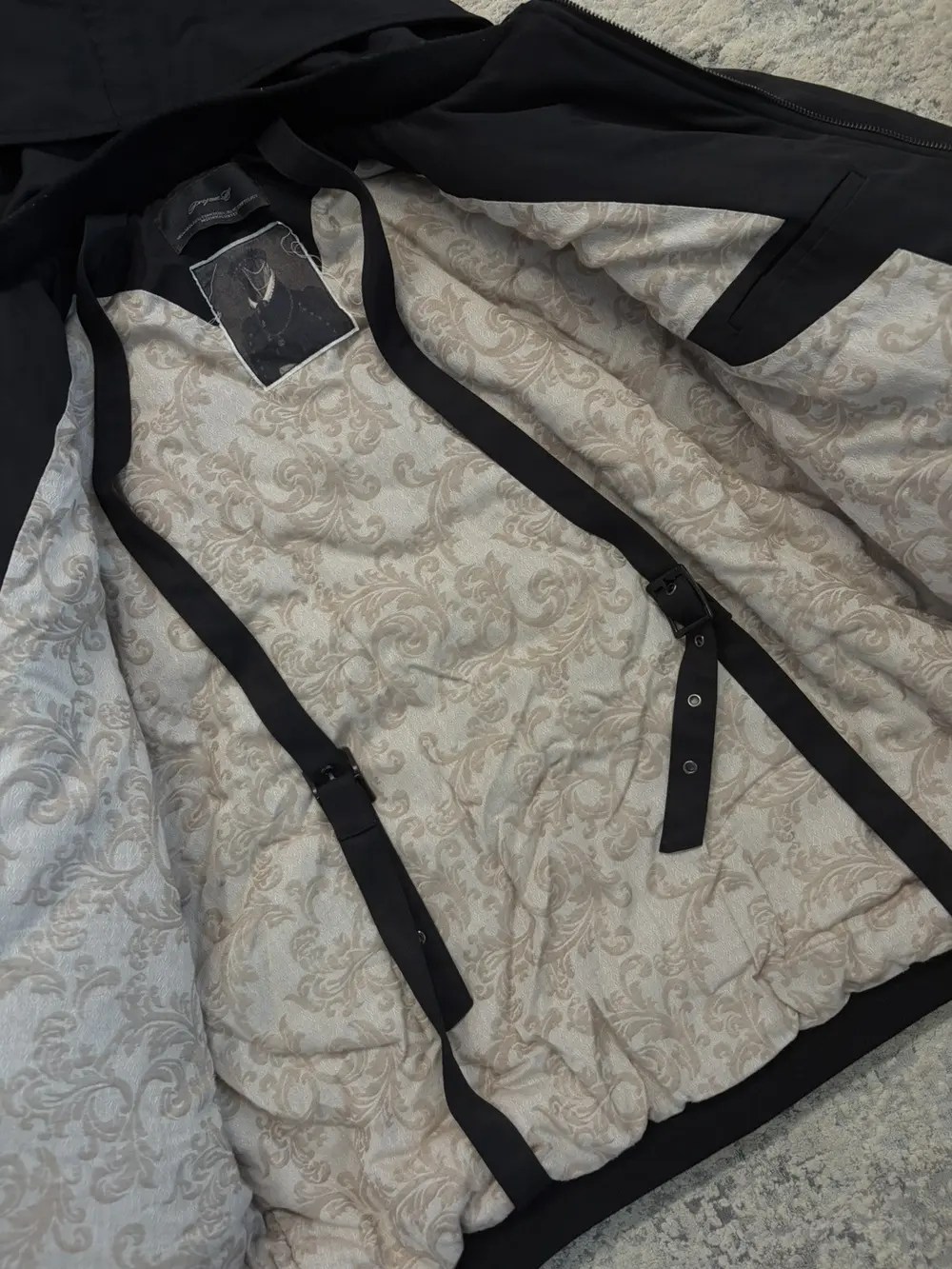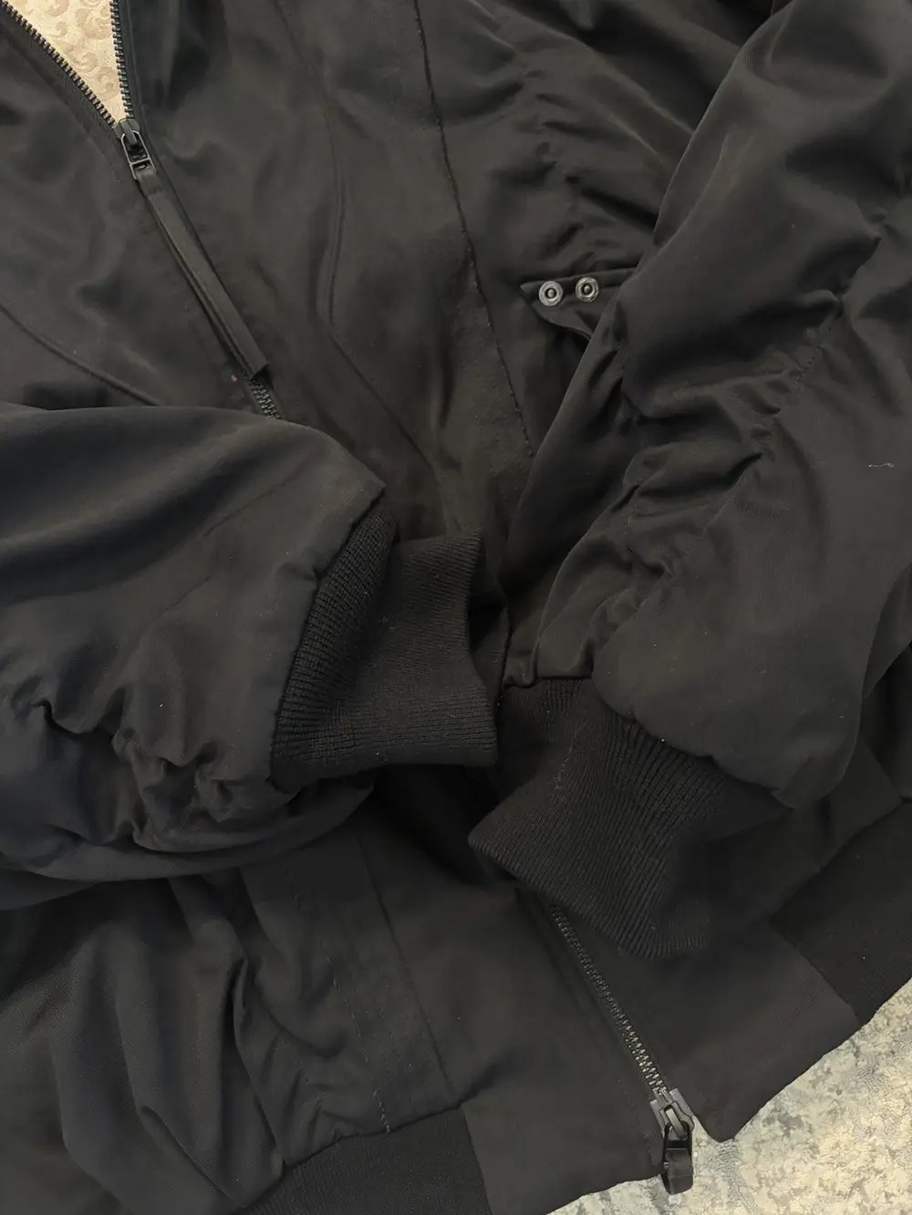 Professor.E oversized bomber cut with exaggerated sleeves and a dropped, rounded silhouette. Built from a heavy cotton‑poly blend that holds its shape and shows the geometric seamwork across the body. Fully lined with a contrast floral interior and equipped with internal backpack straps for off‑shoulder carry
