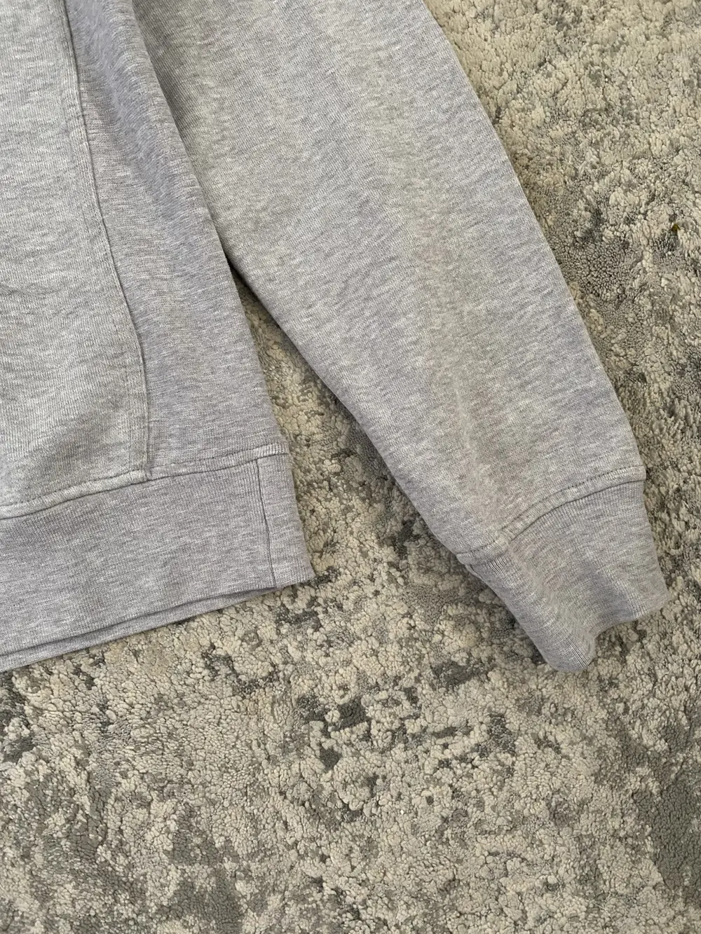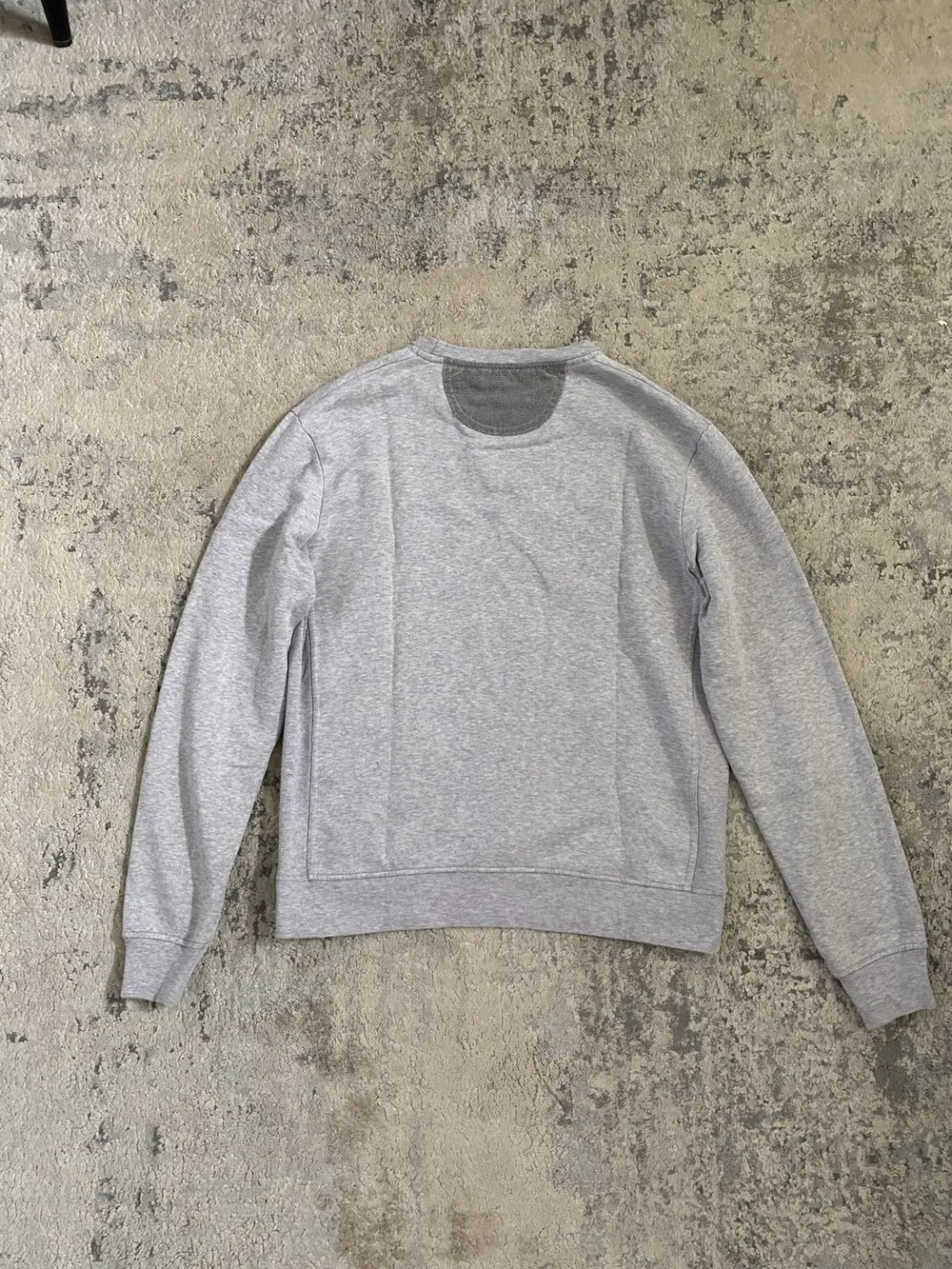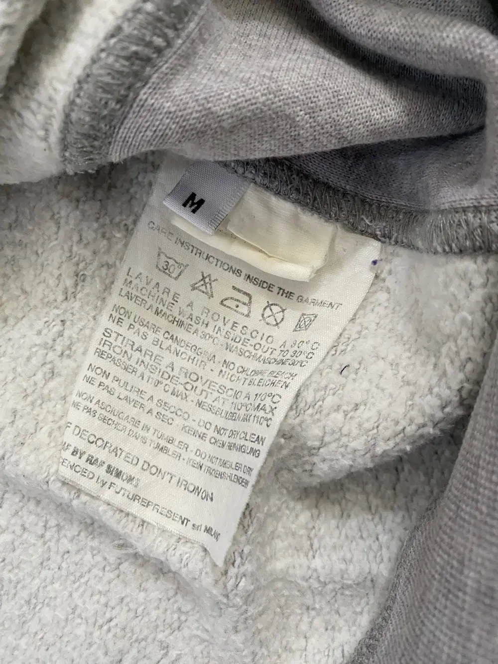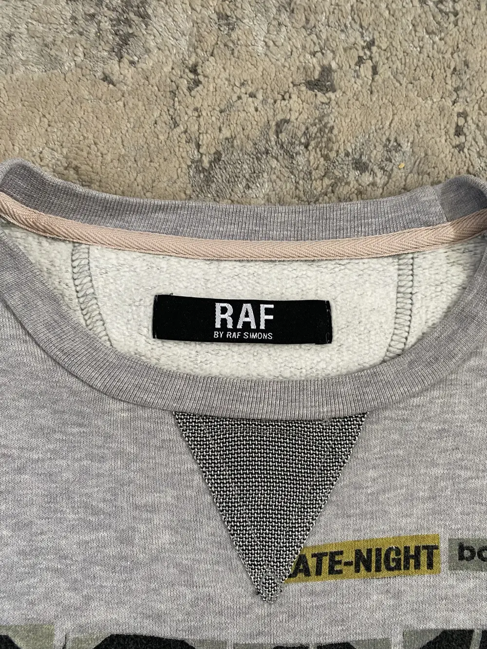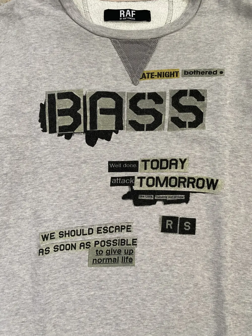 RAF by Raf Simons “BASS” grey crewneck sweatshirt from A/W 2011. Incredibly grunge-cyber-Y2K style typography and use of fonts. Chainmail style wire thread mesh panel on the front and back of the collar. Tagged a size M