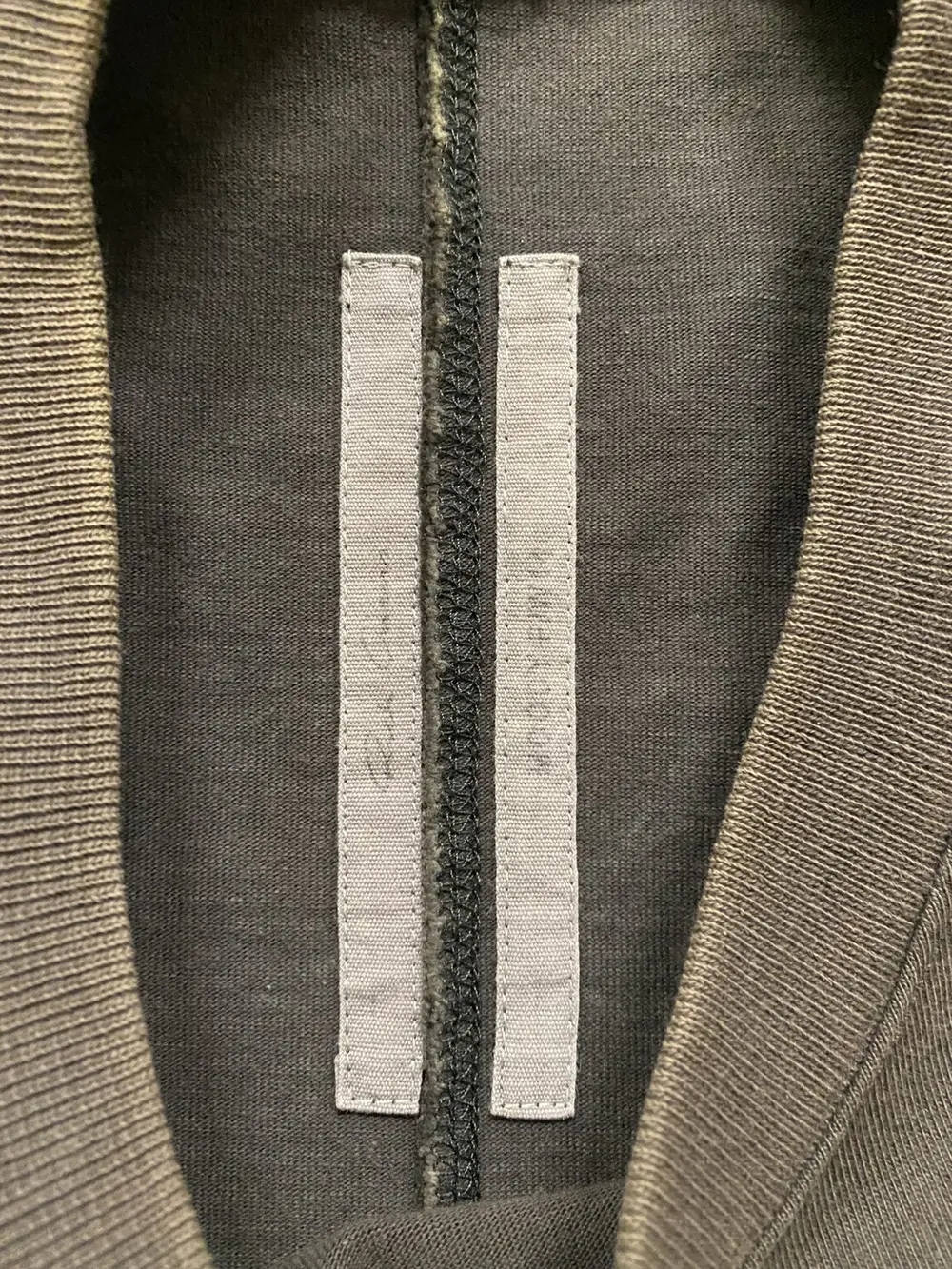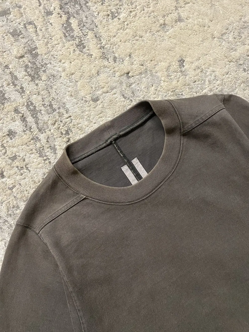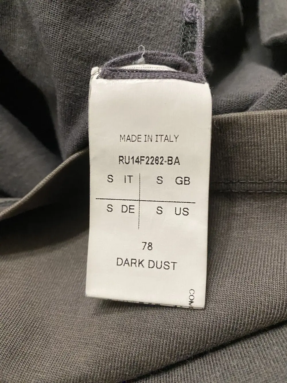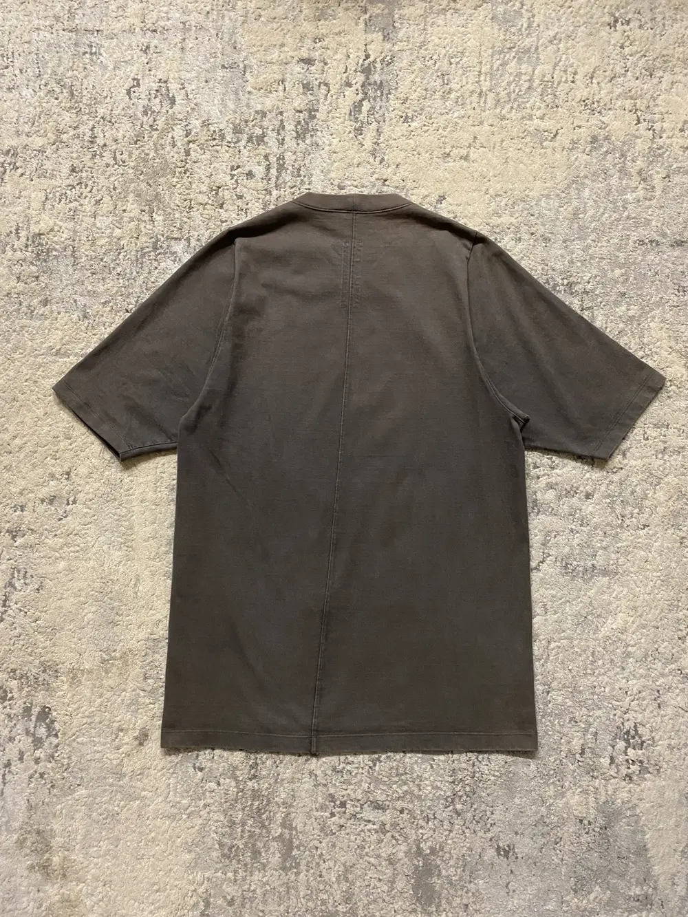 Rick Owens mainline Fall/Winter 2014 “Moody” oversized tee in dark dust — a faded brownish‑gray. Features an elongated body, elongated short sleeves with a narrower shoulder width, signature two‑stripe collection tags, and a central back seam. Material is heavier than a normal t shirt, almost a sweatshirt type material and the neck is a standard t shirt crewneck.