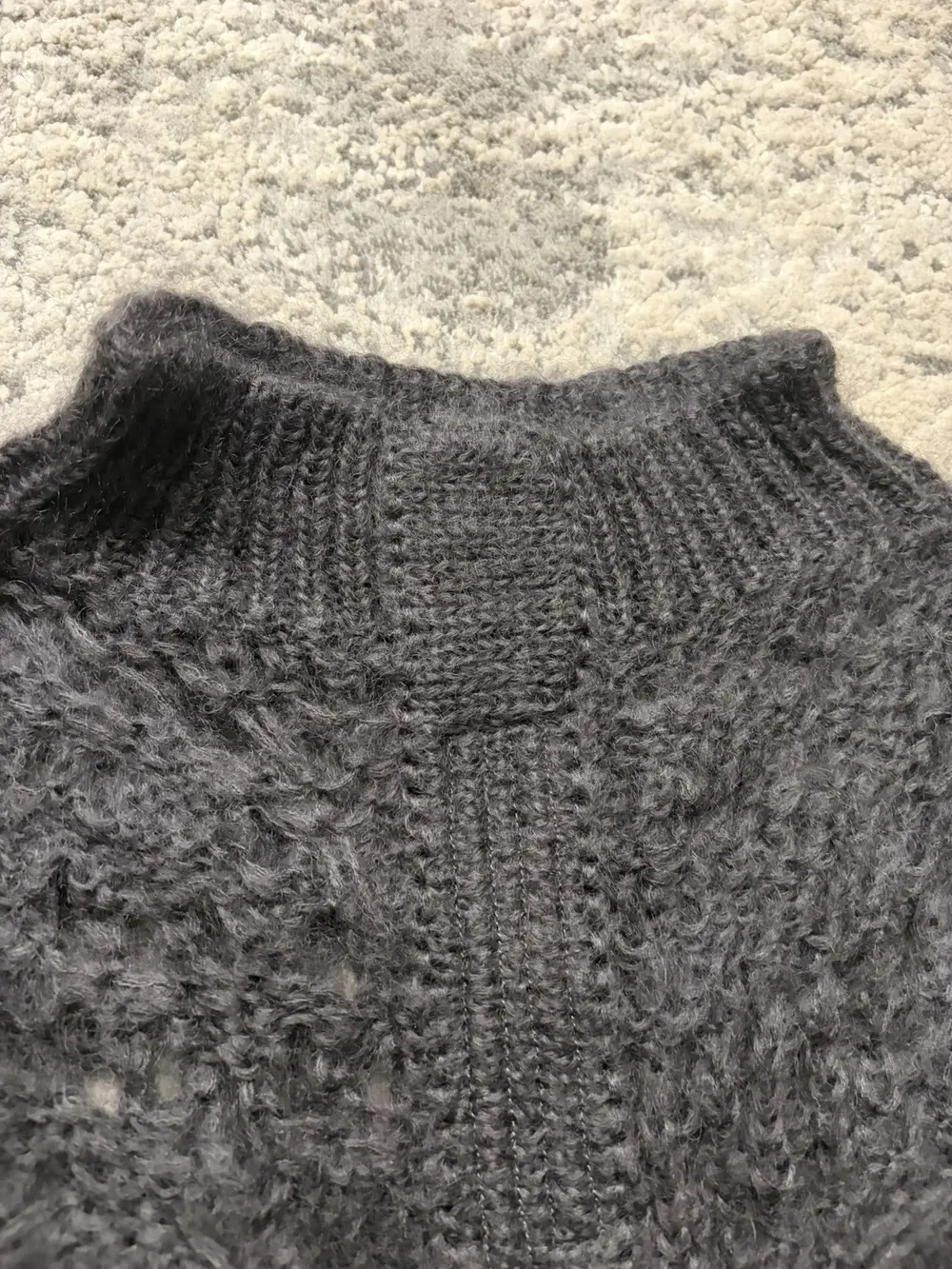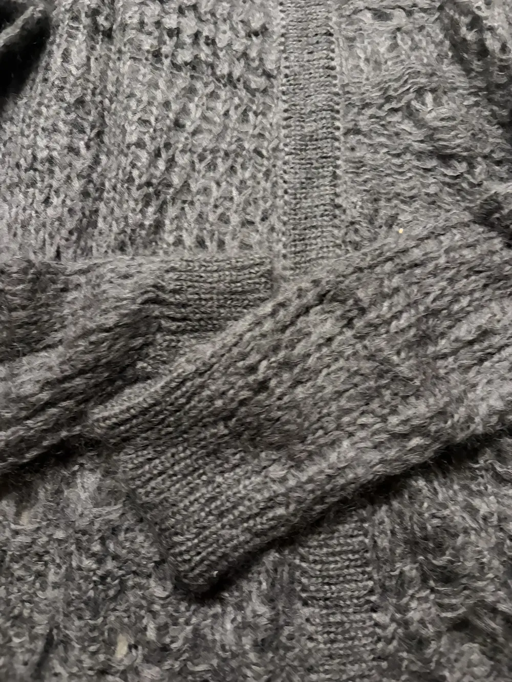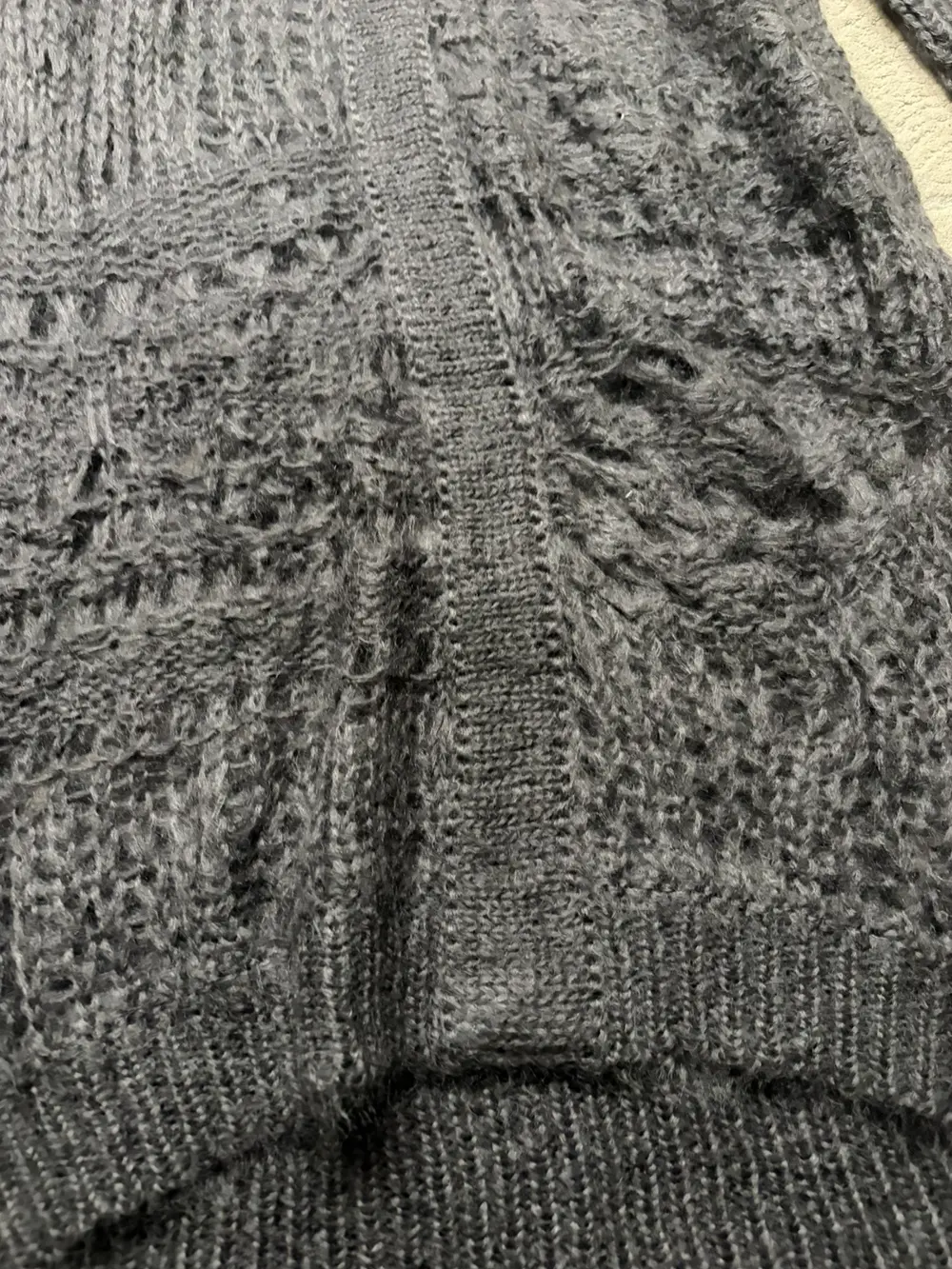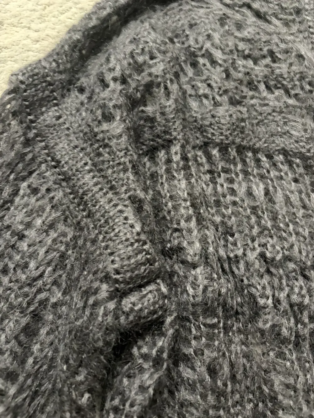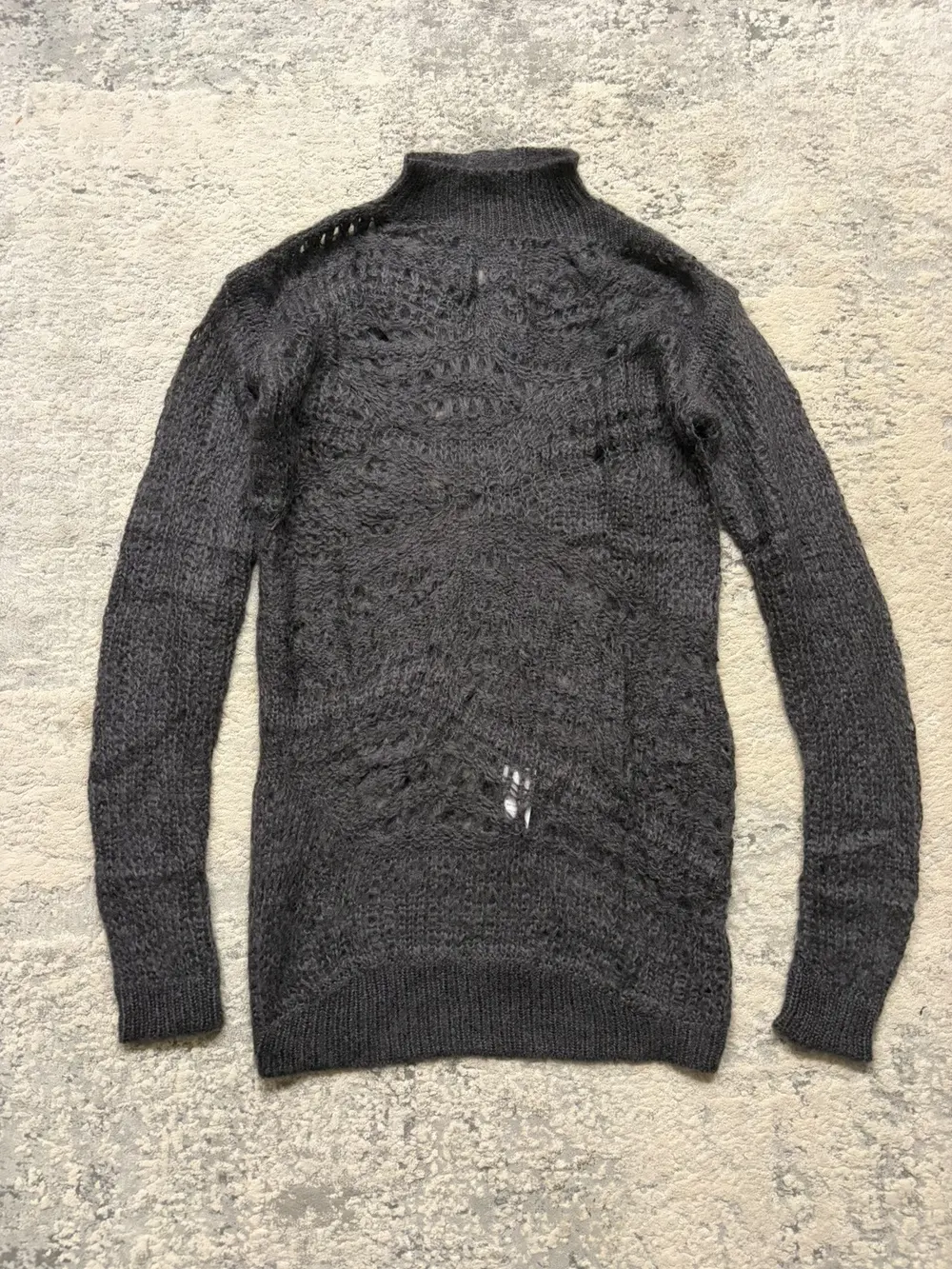 FW14 “Moody” knit with exaggerated sleeves and elongated body with a soft grey wool construction. Features a unique textured knit pattern and a subtle raised mock‑turtleneck. While the silhouette is long, you can hike up the hem to make it a normal length.