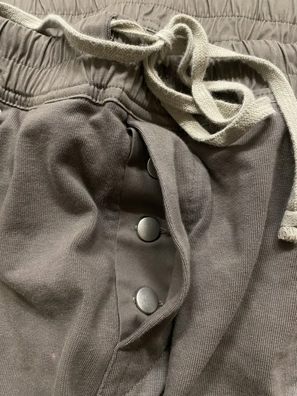 Rick Owens Mainline FW21 Gethsemane Cargo Jogger is designed with cargo side button and zipper pockets for utility and storage. It features a cream elongated drawstring that adds a signature Rick Owens touch, paired with soft cotton construction for comfort and drape. The jogger-style cuffs create a tapered fit, balancing structure with ease of movement.