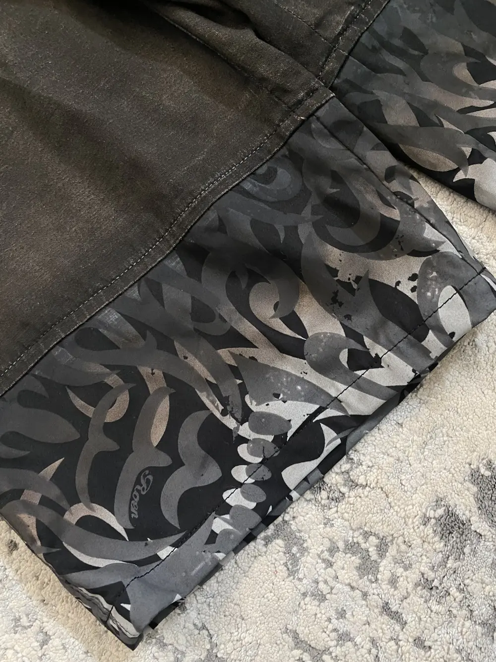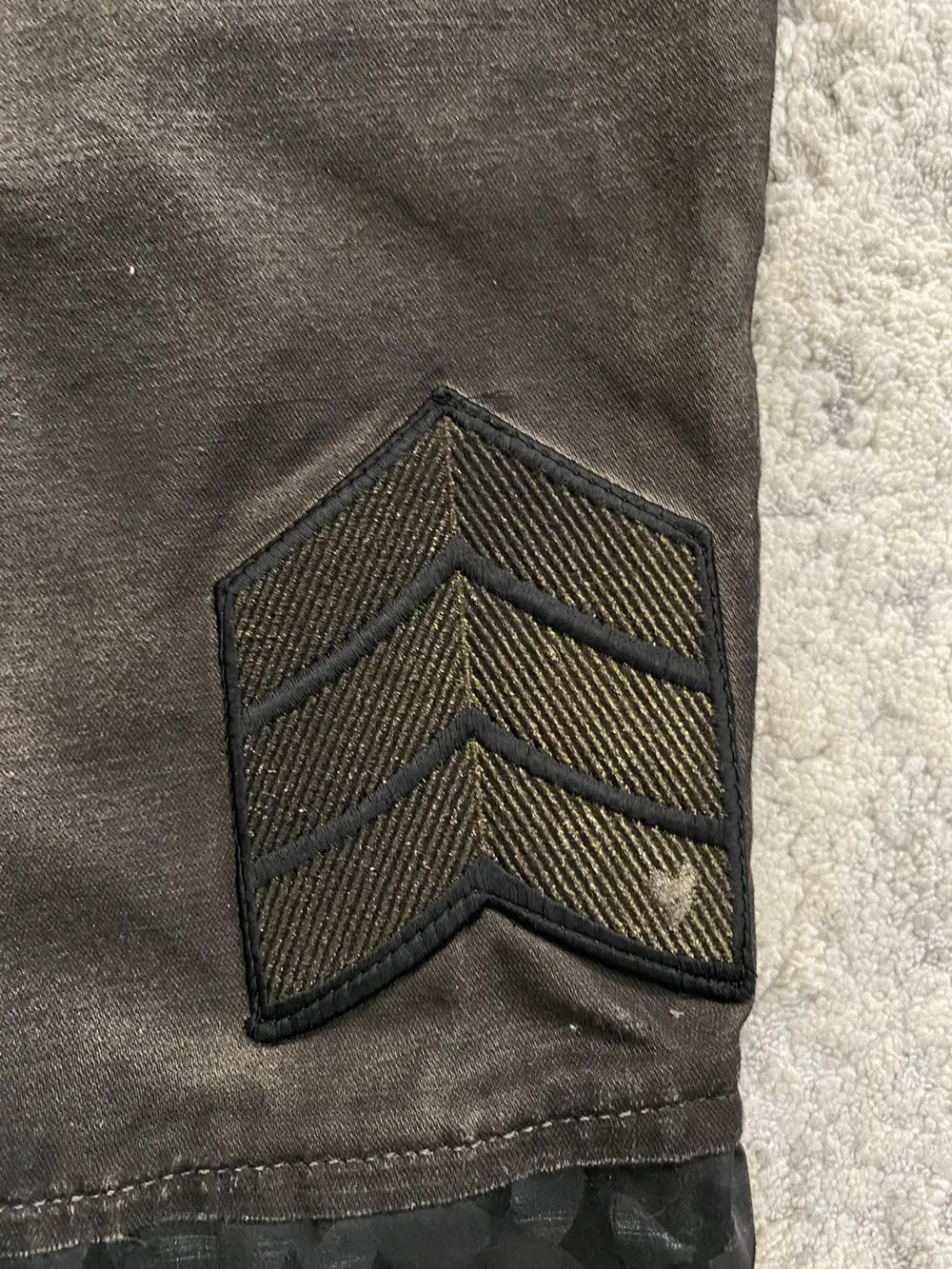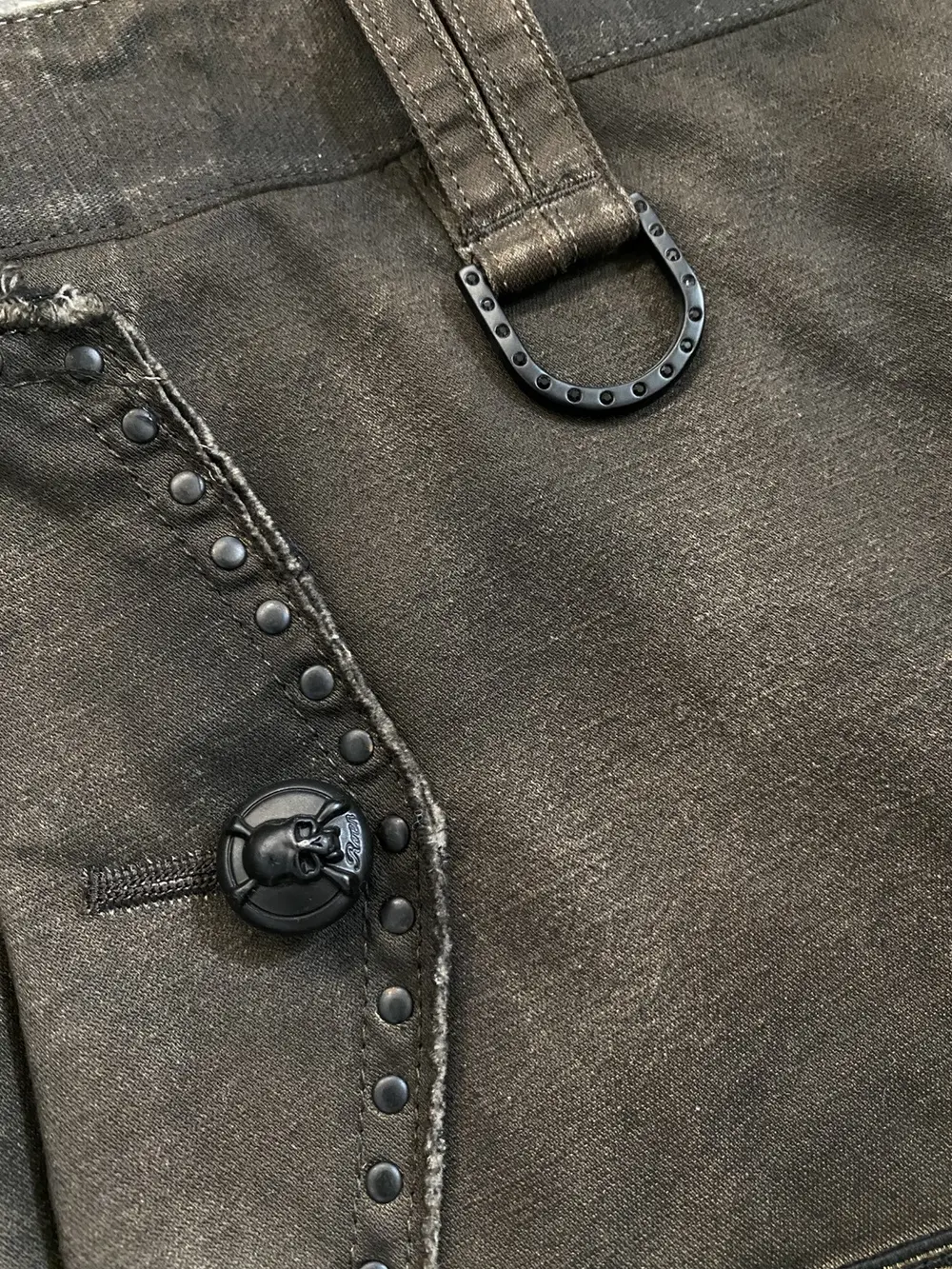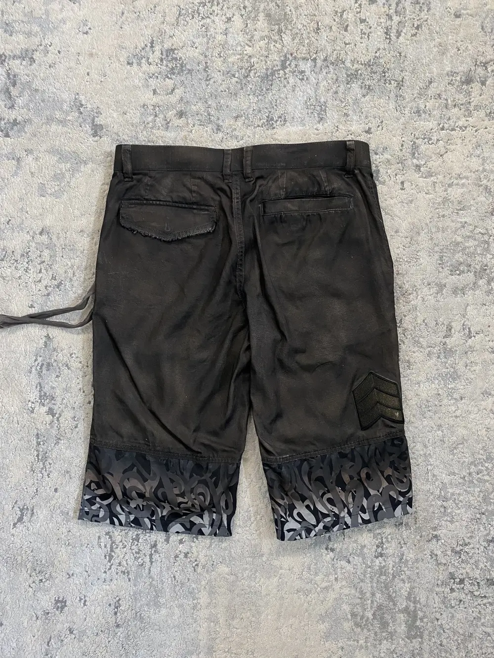 Roen is a Japanese brand known for their intricate blend of punk and military design aesthetic. These shorts feature multiple different custom hardware including skull buttons, studded pockets, military style patchwork embroidery and a crystal embellished belt loop d-ring. The bottom portion of the shorts feature a tribal camo print in a black to white gradient color. Originally retailing for over $300 these shorts are like-new and listed far below retail