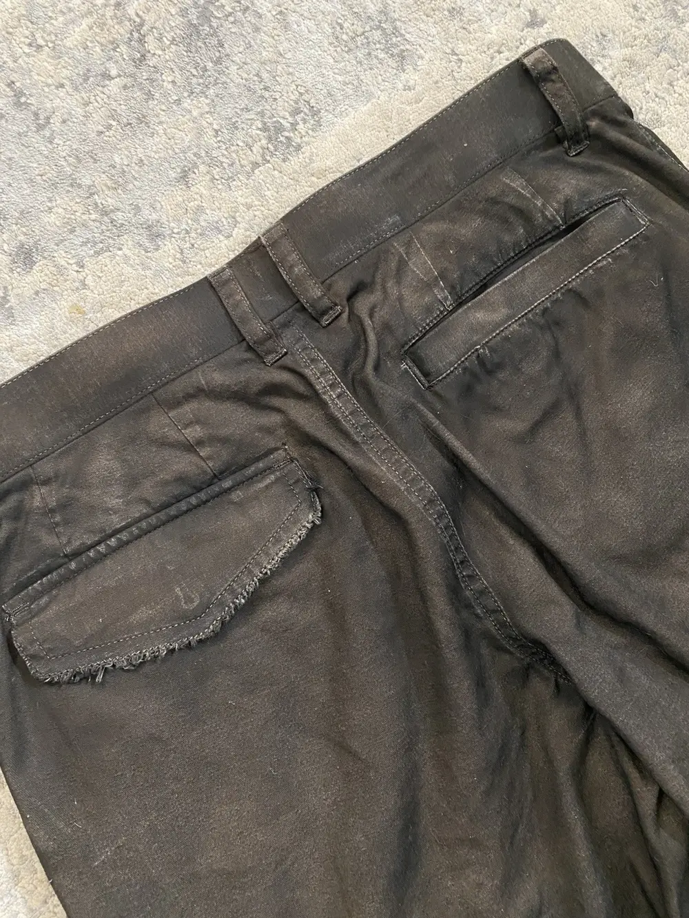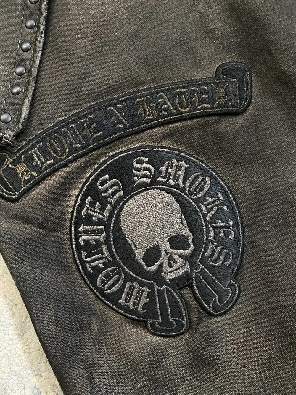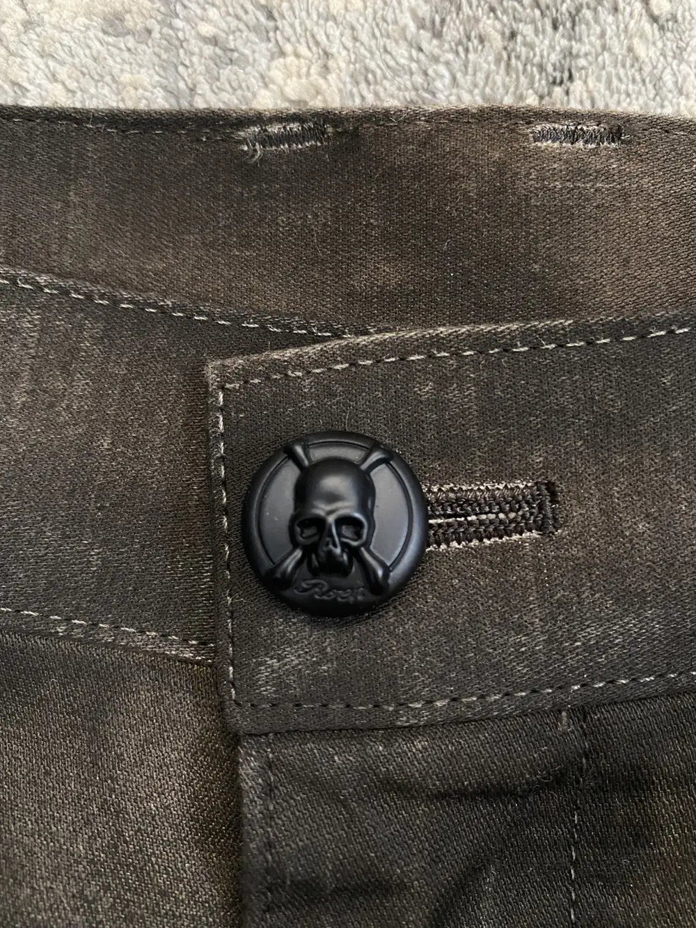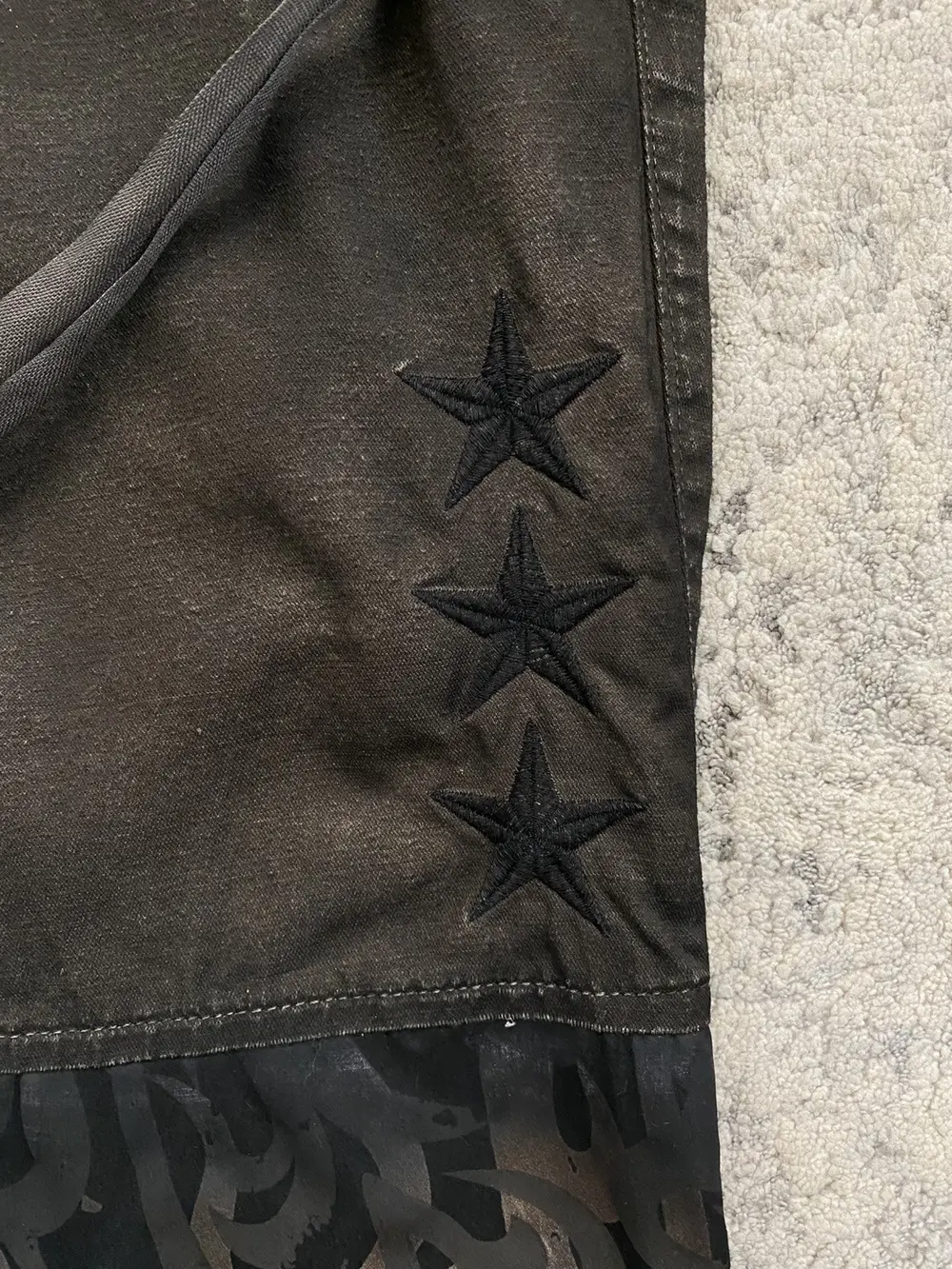 Roen is a Japanese brand known for their intricate blend of punk and military design aesthetic. These shorts feature multiple different custom hardware including skull buttons, studded pockets, military style patchwork embroidery and a crystal embellished belt loop d-ring. The bottom portion of the shorts feature a tribal camo print in a black to white gradient color. Originally retailing for over $300 these shorts are like-new and listed far below retail