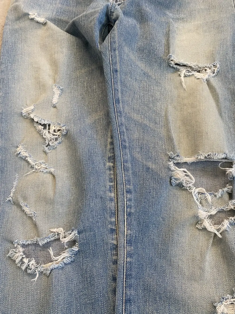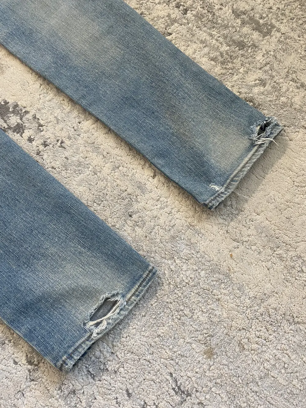 From Hedi Slimane’s career at SLP, these jeans feature large “crash” distressing throughout the front as well as subtle distressing along the pockets, hems and waist. Hedi effortlessly blends his timeless slim fit roots with punk rockstar distressing.