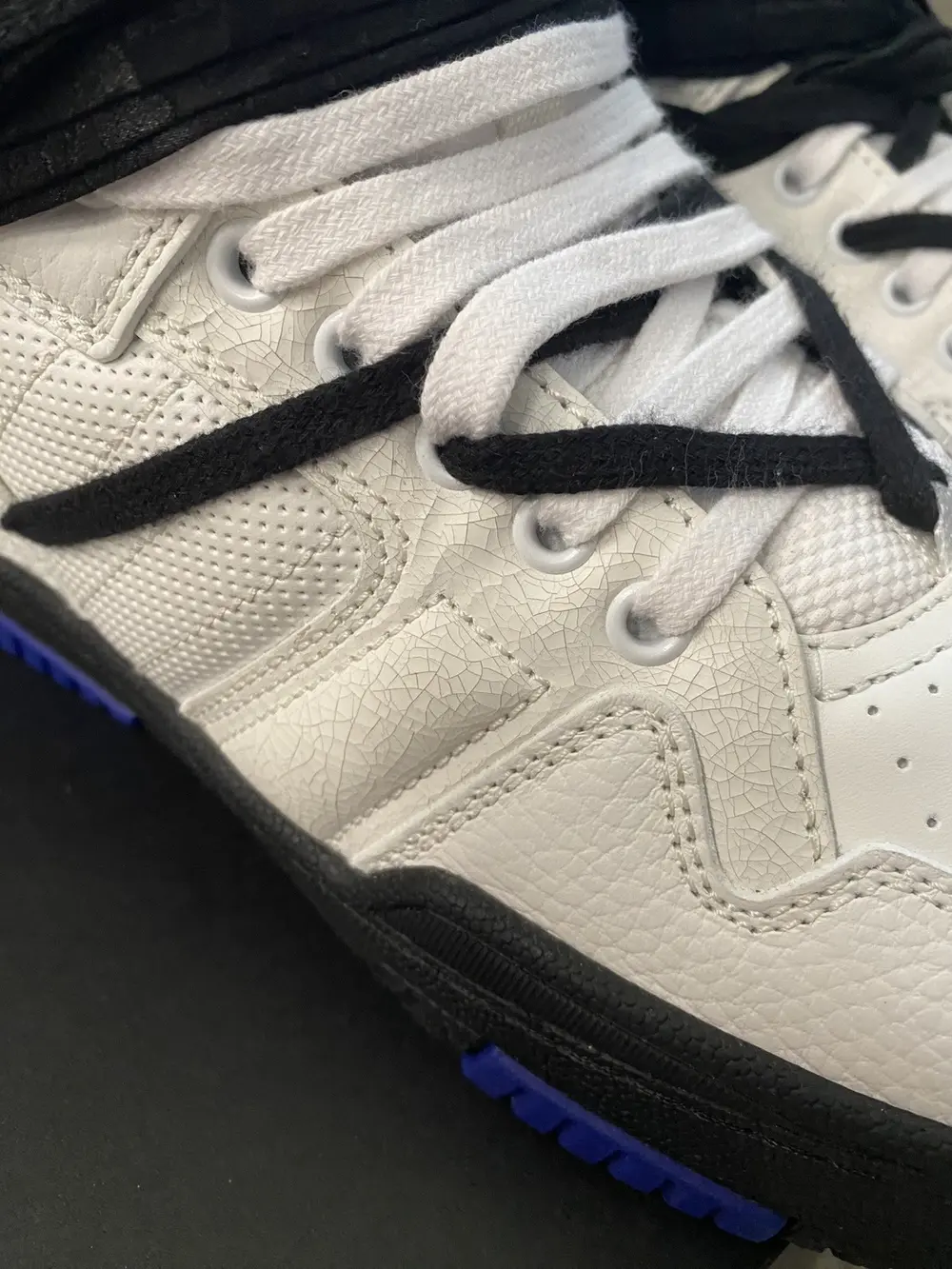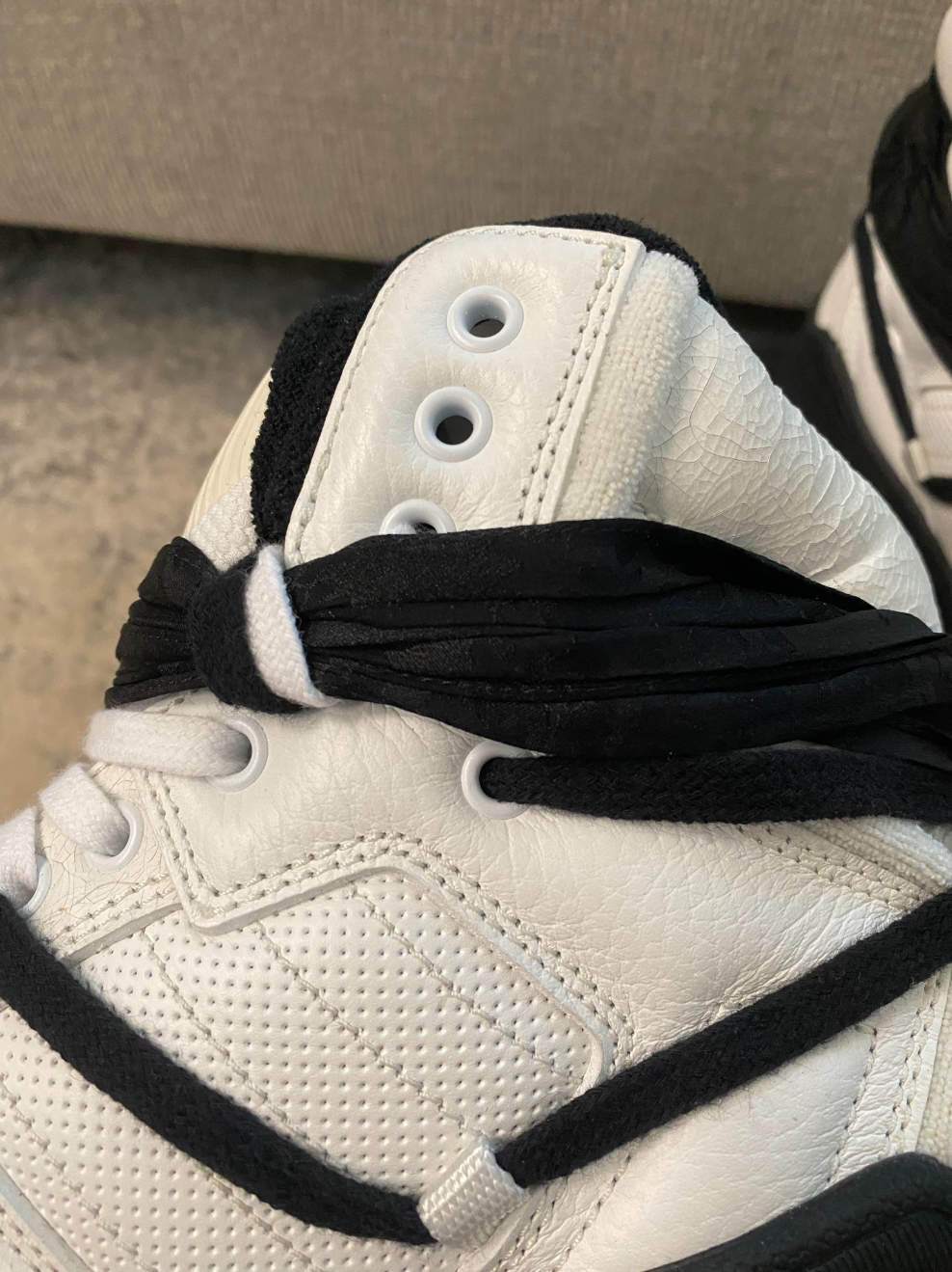 High-top grained calfskin sneakers in white. Distressed and perforated detailing throughout. · Lace-up closure · Self-tie bandana-style trim at vamp · Padded tongue and collar · Logo embroidered at heel counter