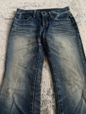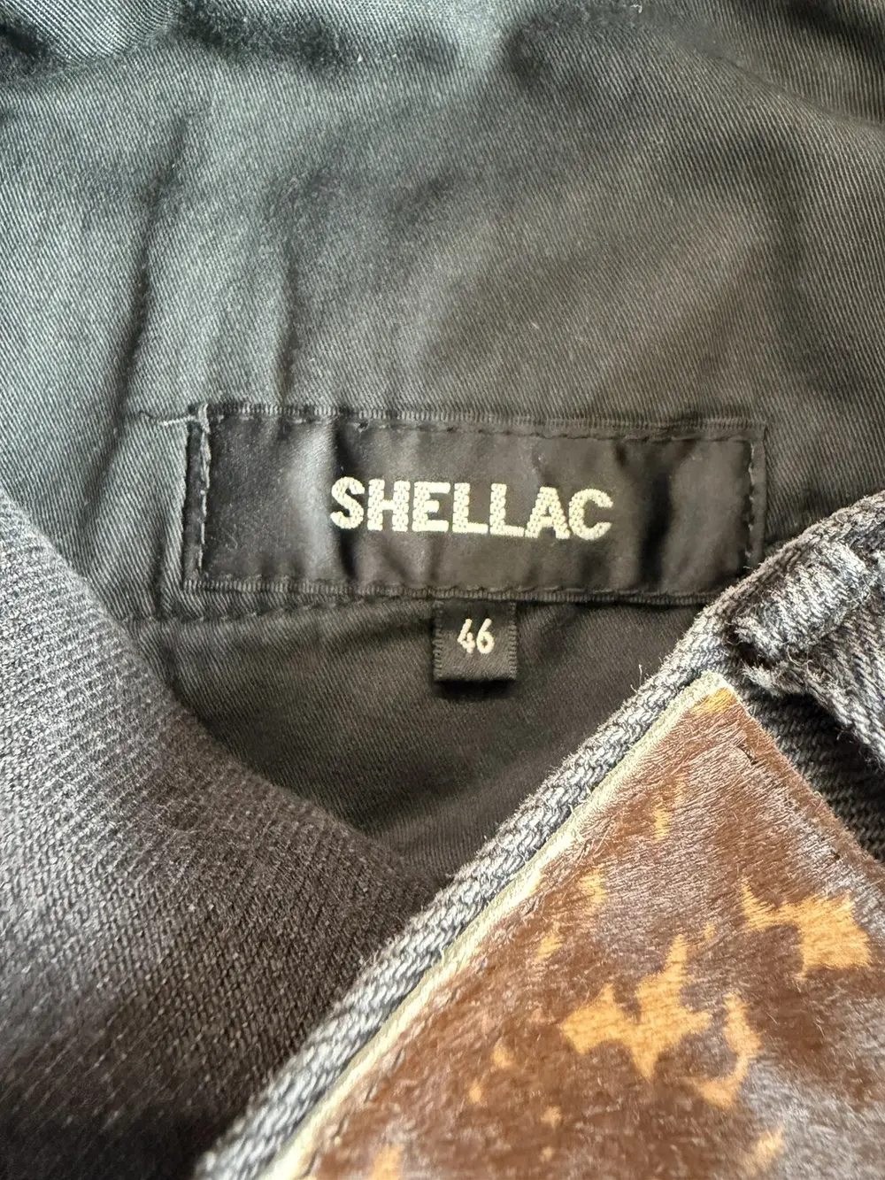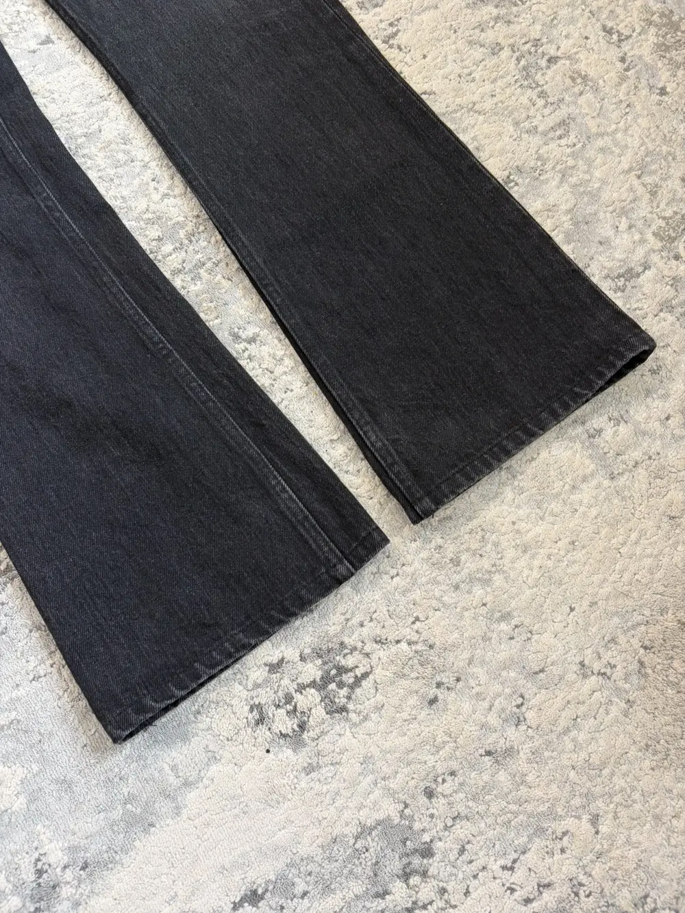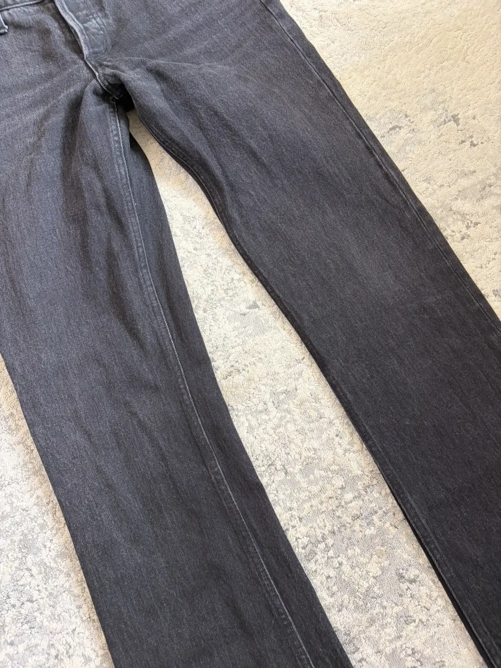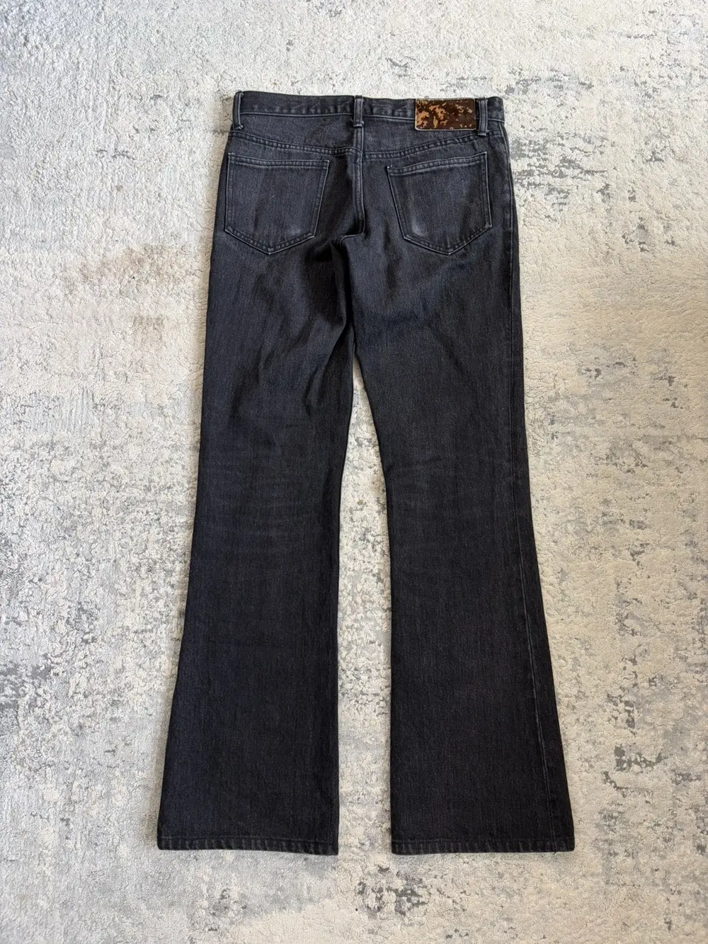 Japanese label Shellac known for their bootcut bottoms, slender tops and exotic material footwear. For sale is a pair of denim in a uniform faded black wash, slim leg fit with a nice bootcut finish going down the hem. Good condition.