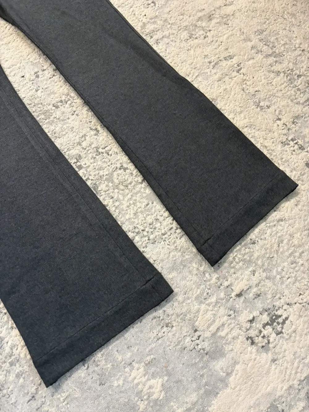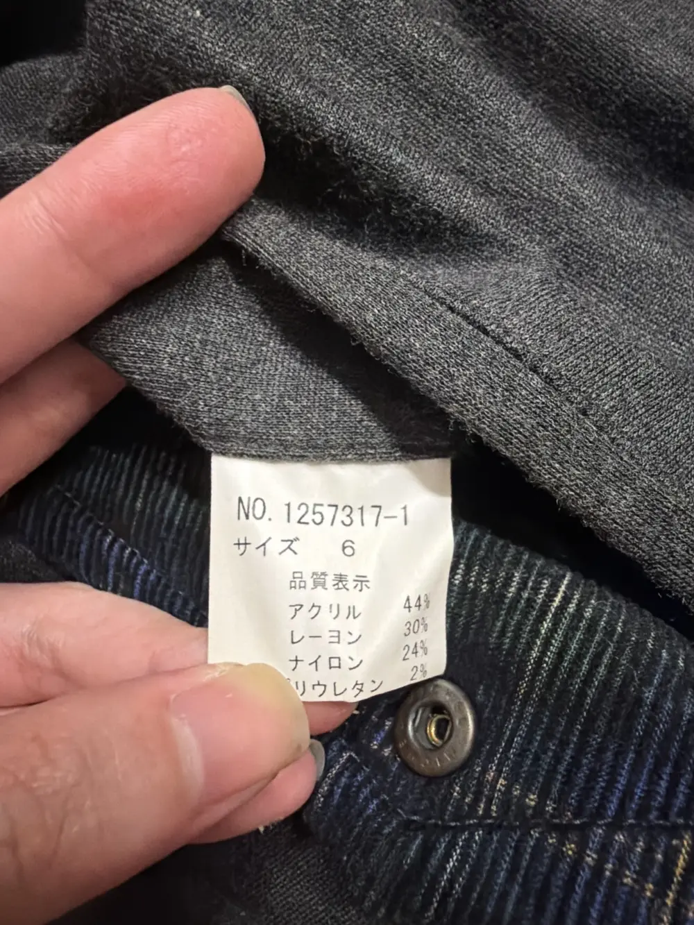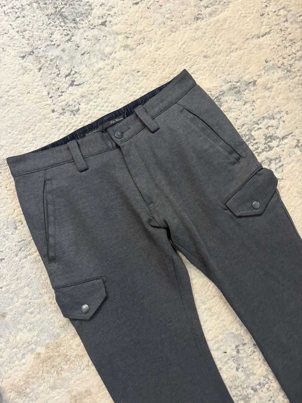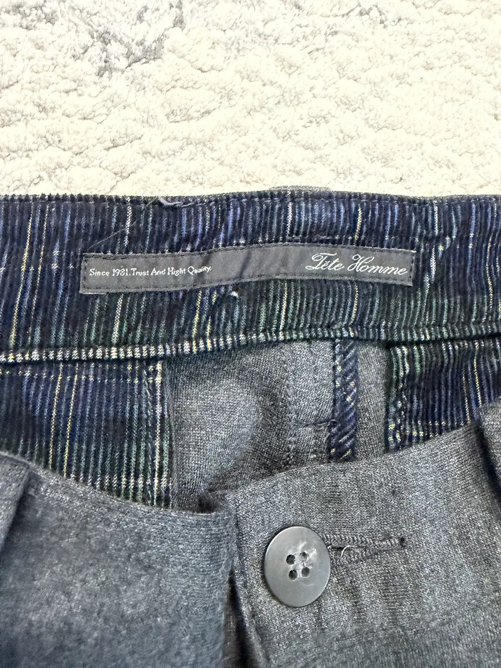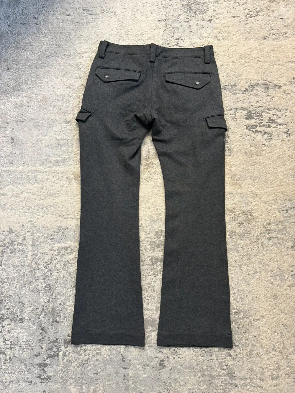 Tete Homme flared pants cut from a soft, stretchy acrylic/rayon/nylon material. The fit carries a clean flare through the leg, with added cargo pockets in addition to the standard front and back pockets for extra storage and visual structure. The waistband is lined with plaid corduroy on the inside