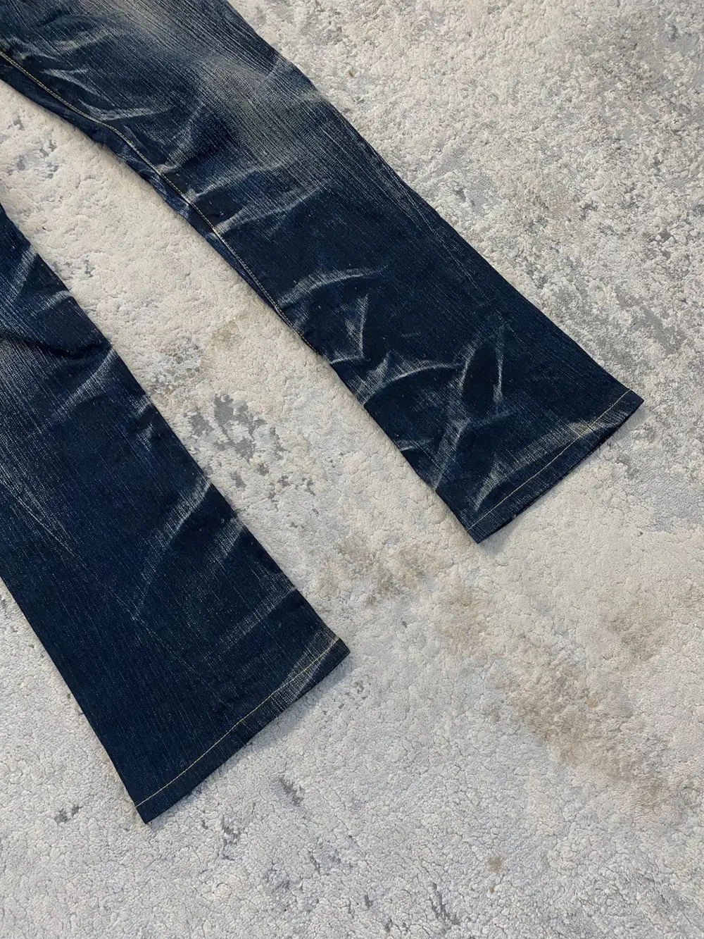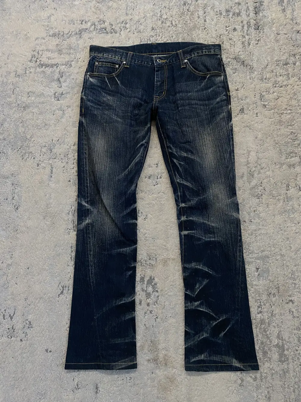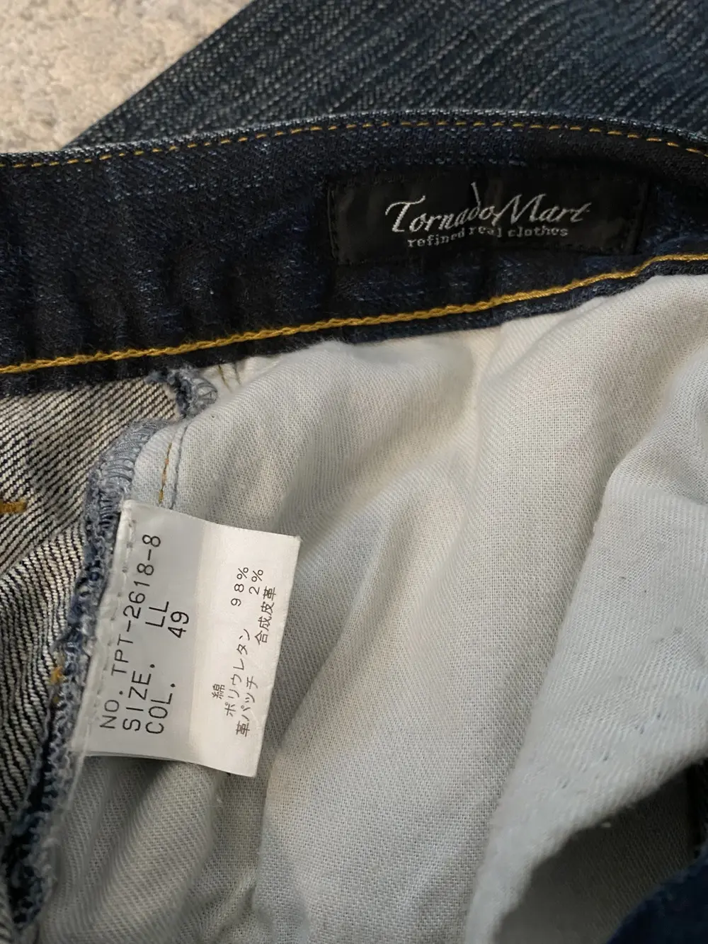 From Japanese label Tornado Mart, known for its sleek silhouettes and elevated streetwear. These jeans are crafted in soft Japanese denim, they feature a whisker fade pattern throughout the thighs and knees, creating a dynamic, worn-in texture that feels intentional and refined. Finished with a subtle bootcut hem, the fit is tailored to sit cleanly over slim-shaft boots or low-top sneakers.