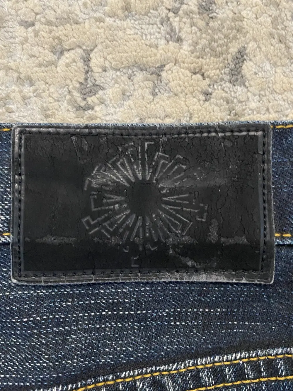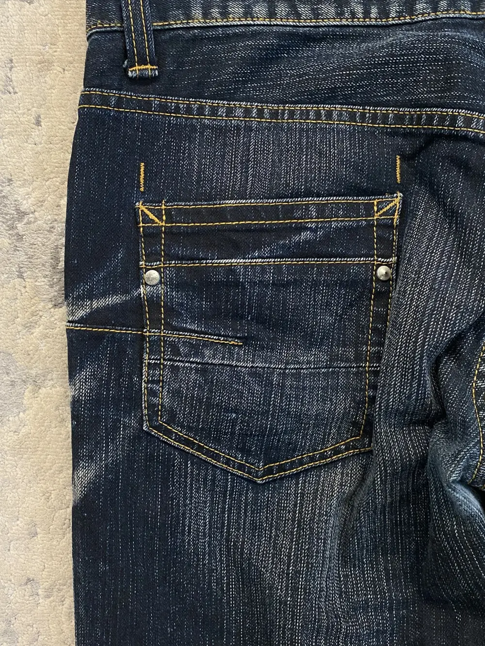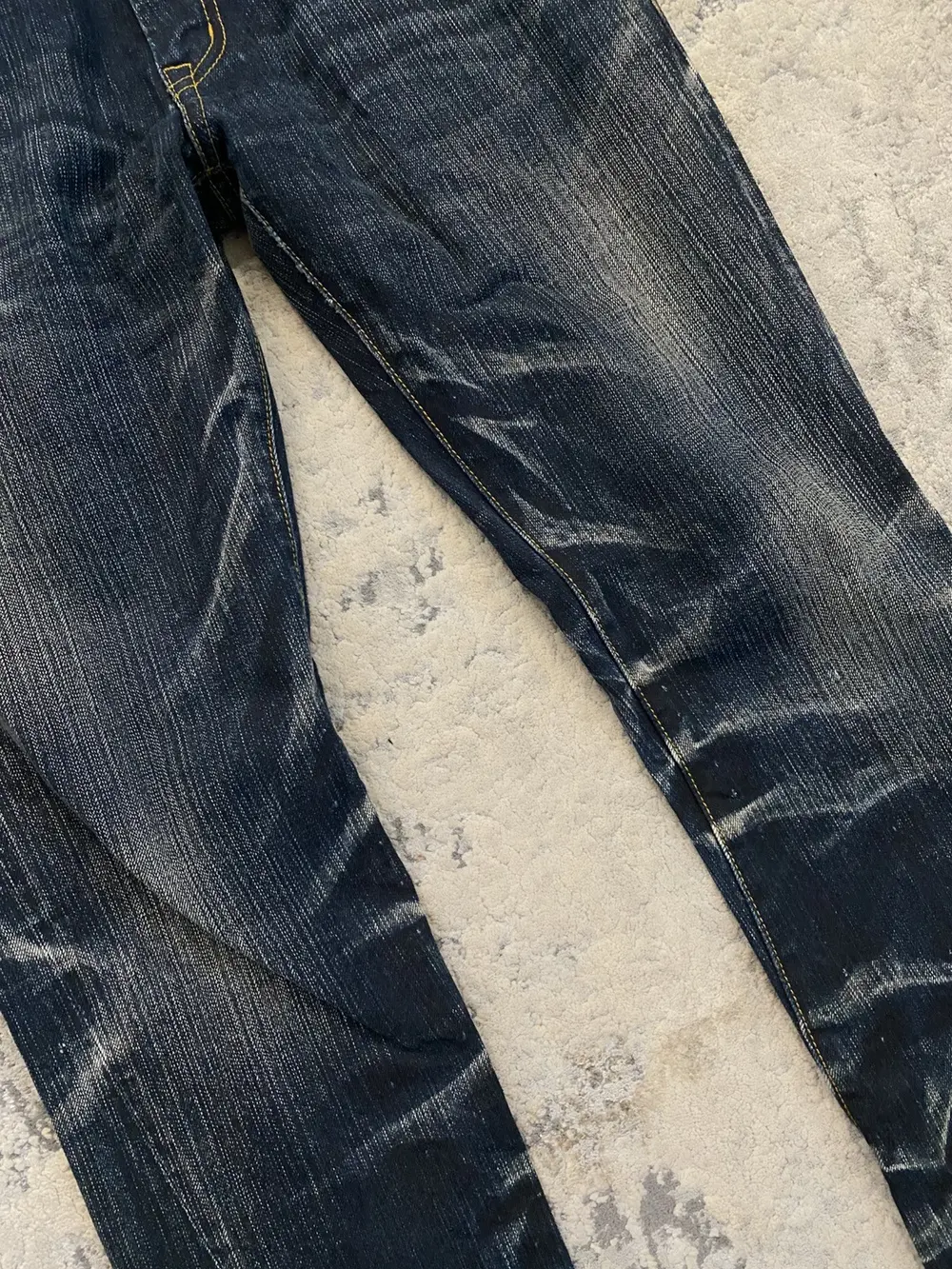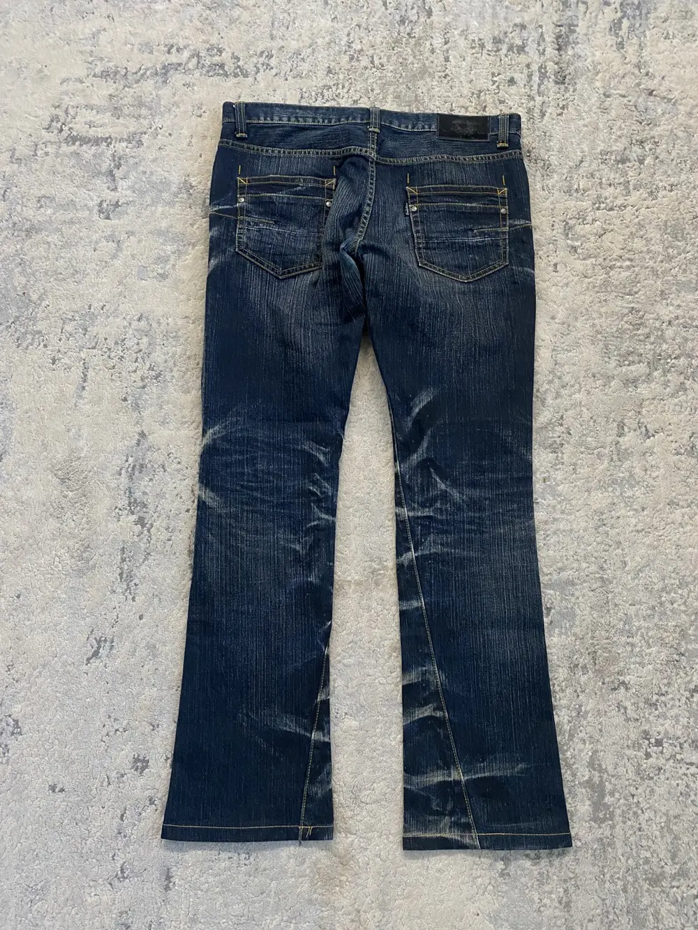From Japanese label Tornado Mart, known for its sleek silhouettes and elevated streetwear. These jeans are crafted in soft Japanese denim, they feature a whisker fade pattern throughout the thighs and knees, creating a dynamic, worn-in texture that feels intentional and refined. Finished with a subtle bootcut hem, the fit is tailored to sit cleanly over slim-shaft boots or low-top sneakers.