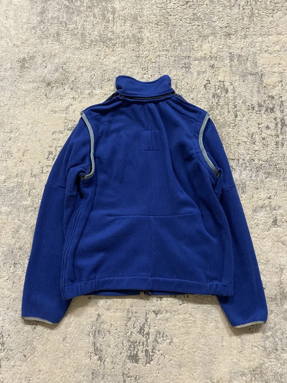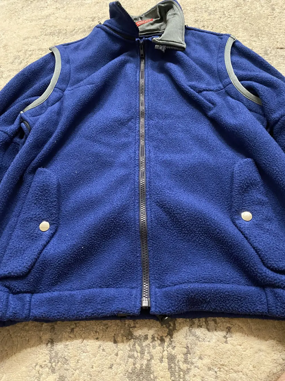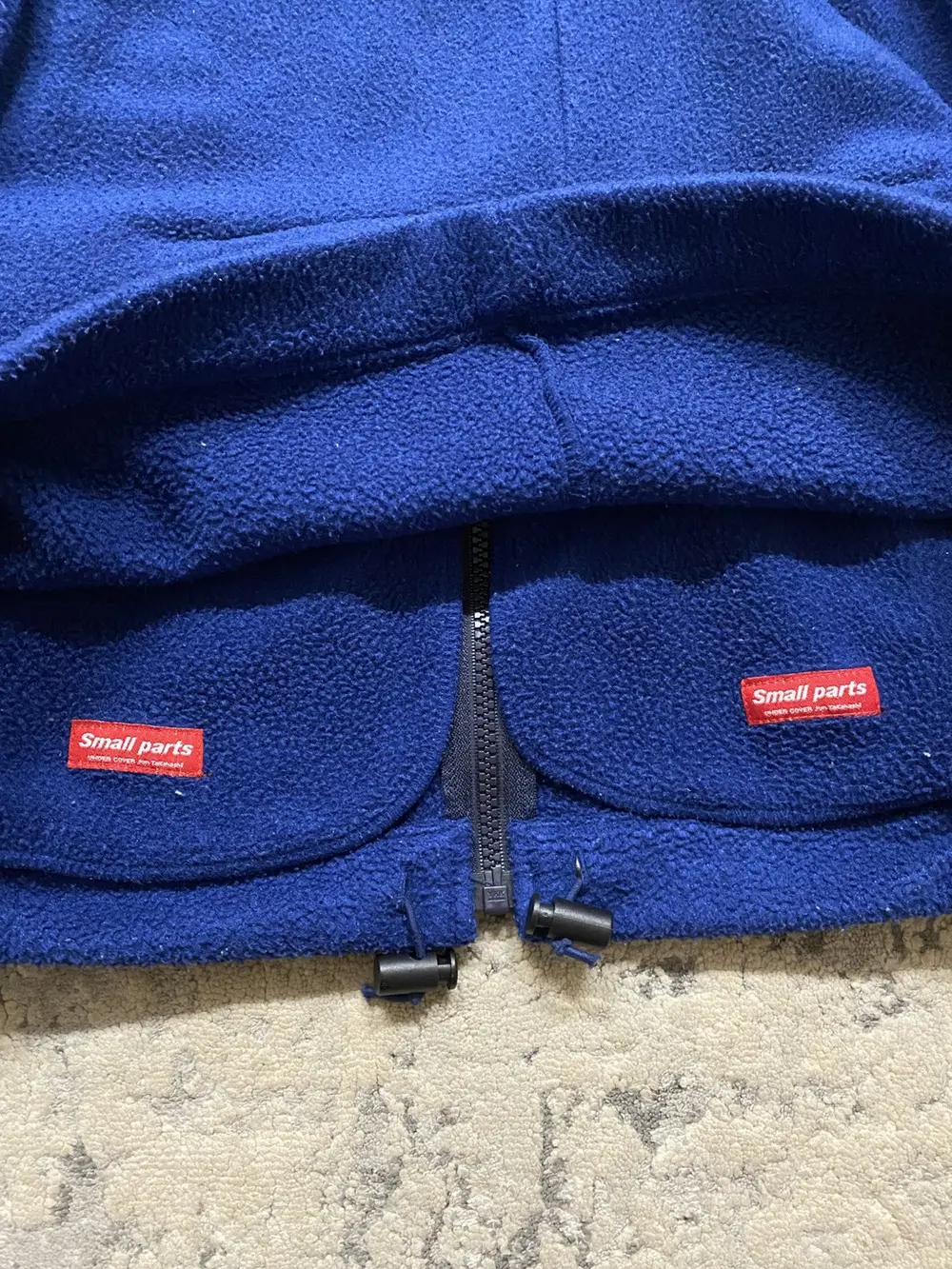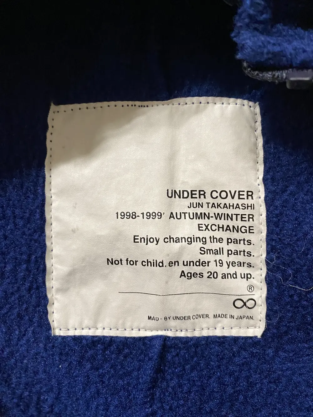 Undercover Autumn/Winter 1998 “Exchange Small Parts” collection fleece jacket in blue. Rare archival piece from Jun Takahashi’s modular design era, featuring a fully detachable collar, sleeves, and body panels for customizable wear. Constructed in soft fleece with a drawstring hem for adjustable fit and silhouette. A standout from the Small Parts concept, this jacket embodies Takahashi’s experimental approach to functionality and deconstruction—equal parts collectible and wearable.