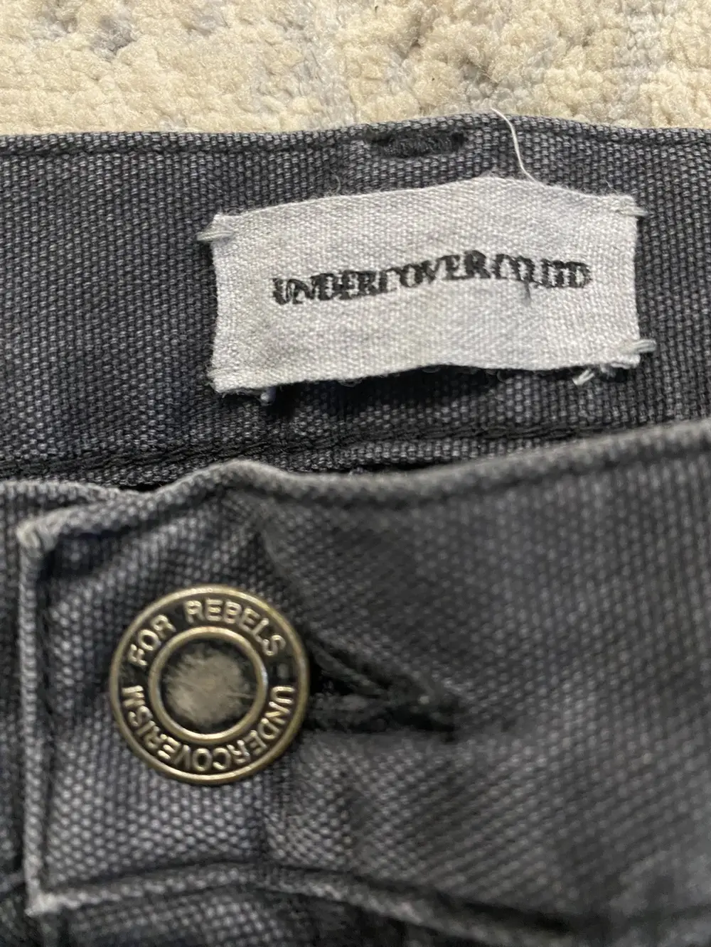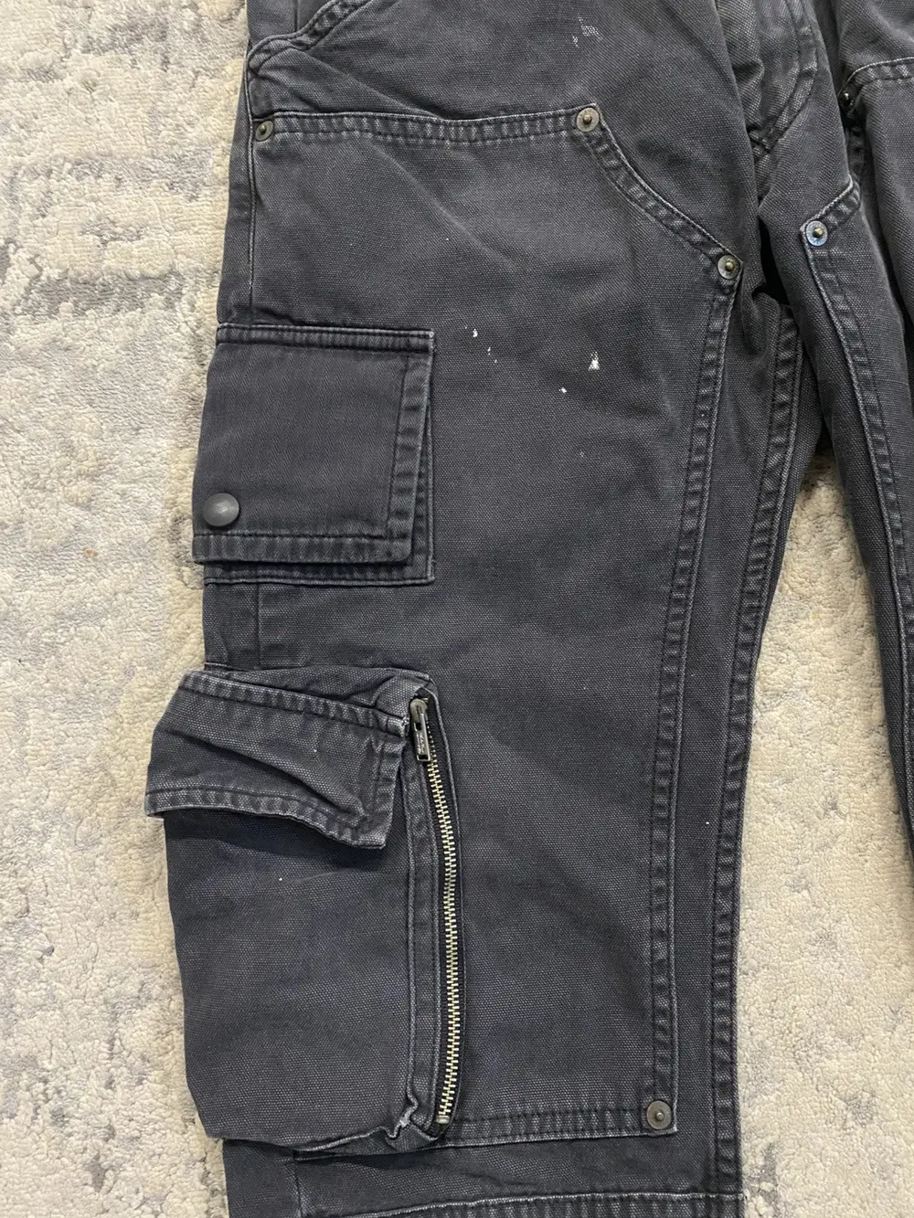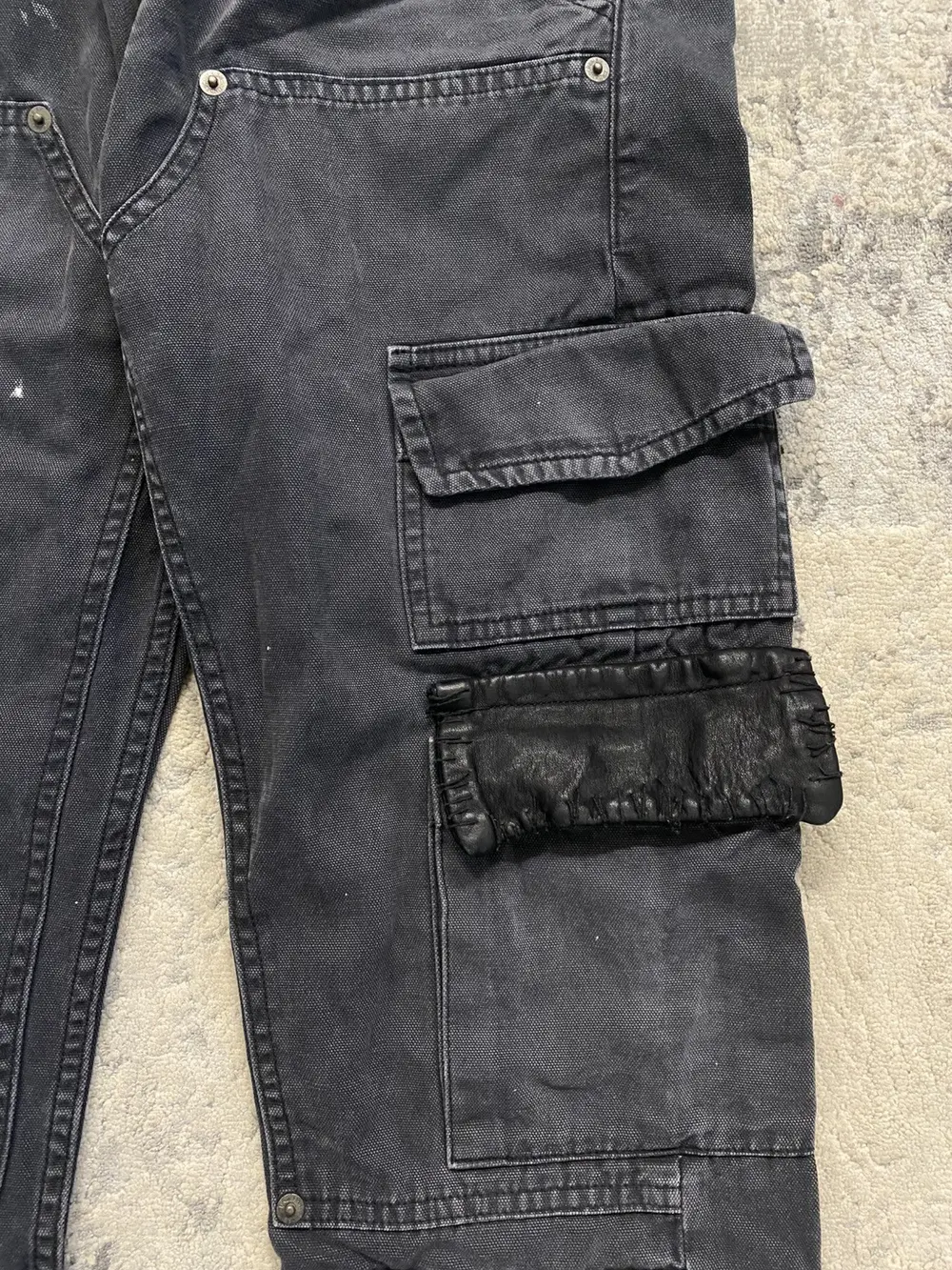 Boasting a riveted thigh panel and a mix of snap-button and zipper pockets—one adorned with a stitched leather flap—these pants fuse gritty DIY punk vibes with rugged, functional design. Undercover branded buttons and zippers can be found throughout the pant. A button is missing from the back pocket and a few paint marks on the legs. (pictured)
