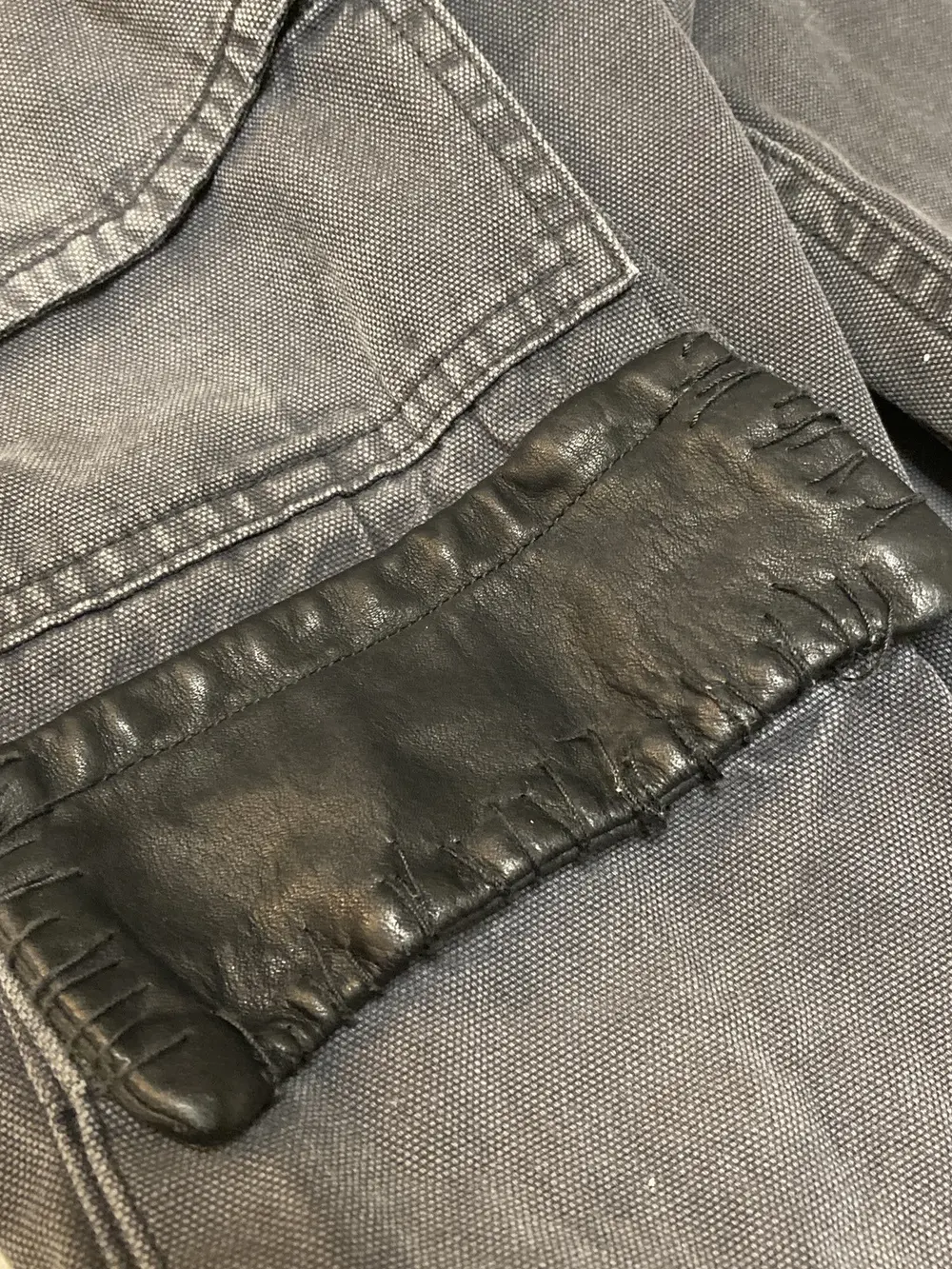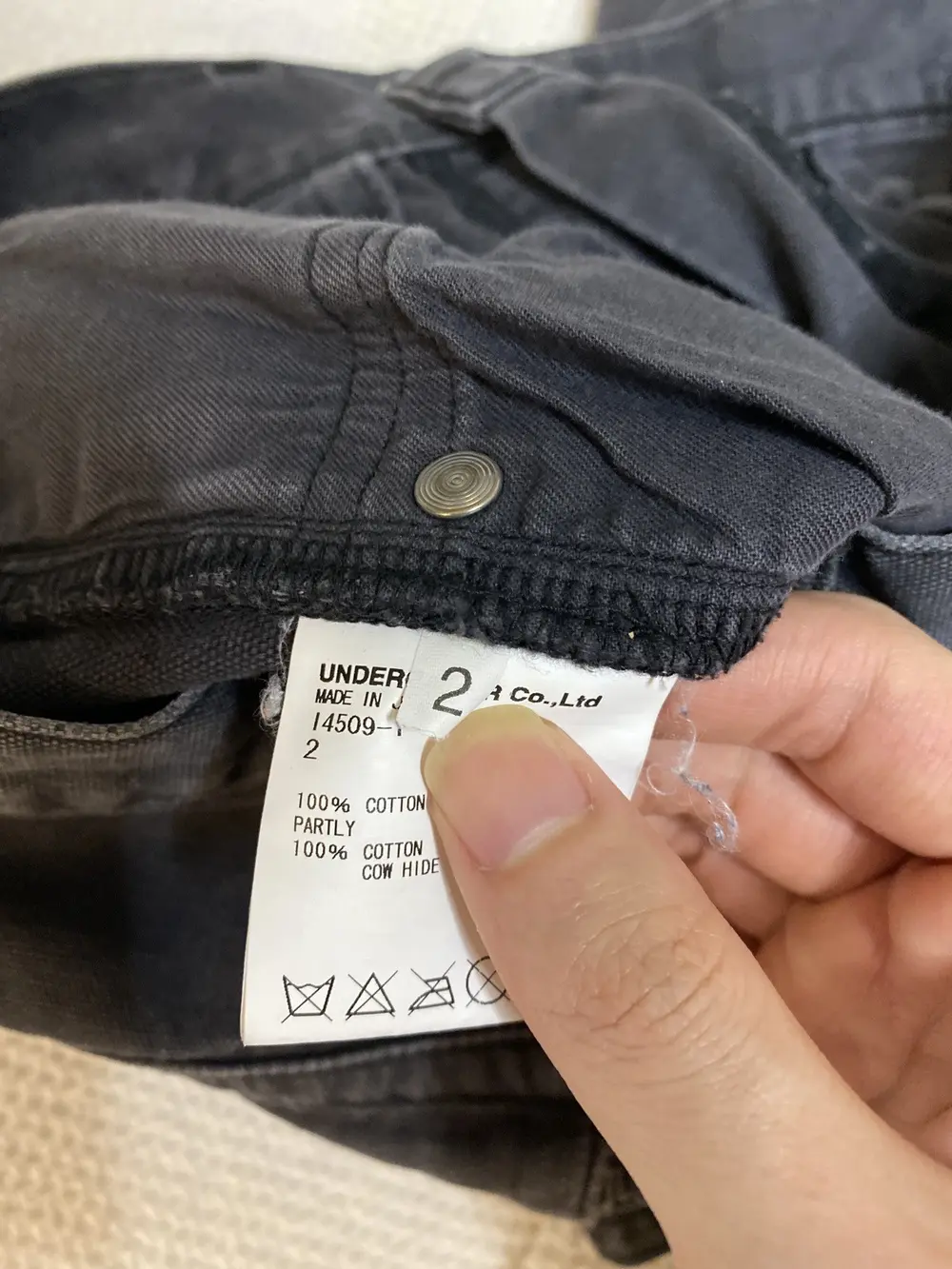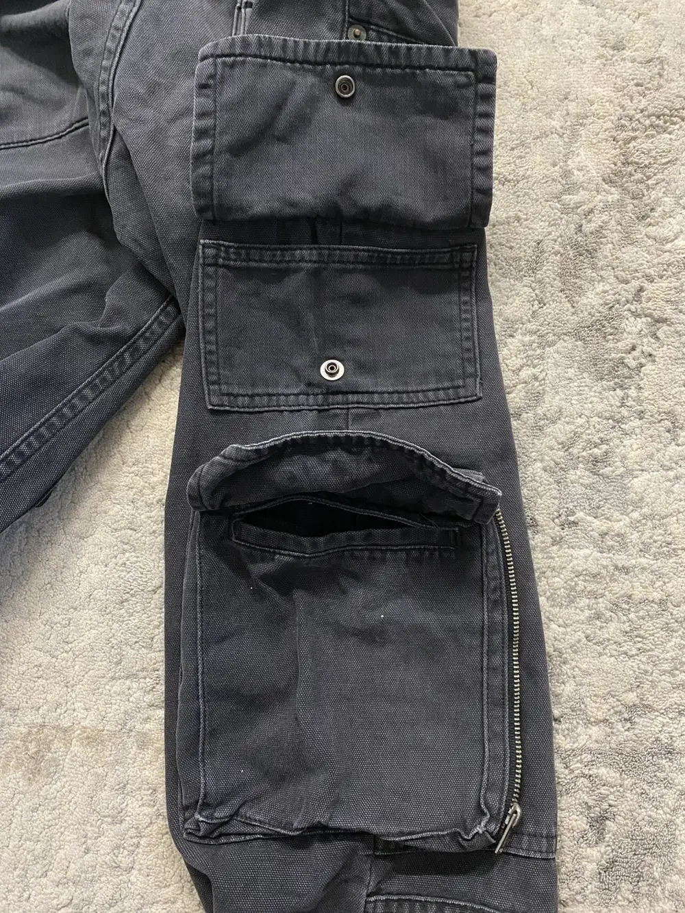 Boasting a riveted thigh panel and a mix of snap-button and zipper pockets—one adorned with a stitched leather flap—these pants fuse gritty DIY punk vibes with rugged, functional design. Undercover branded buttons and zippers can be found throughout the pant. A button is missing from the back pocket and a few paint marks on the legs. (pictured)