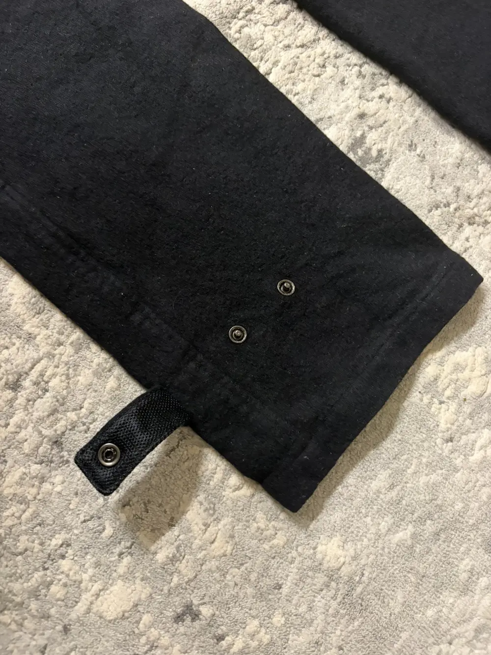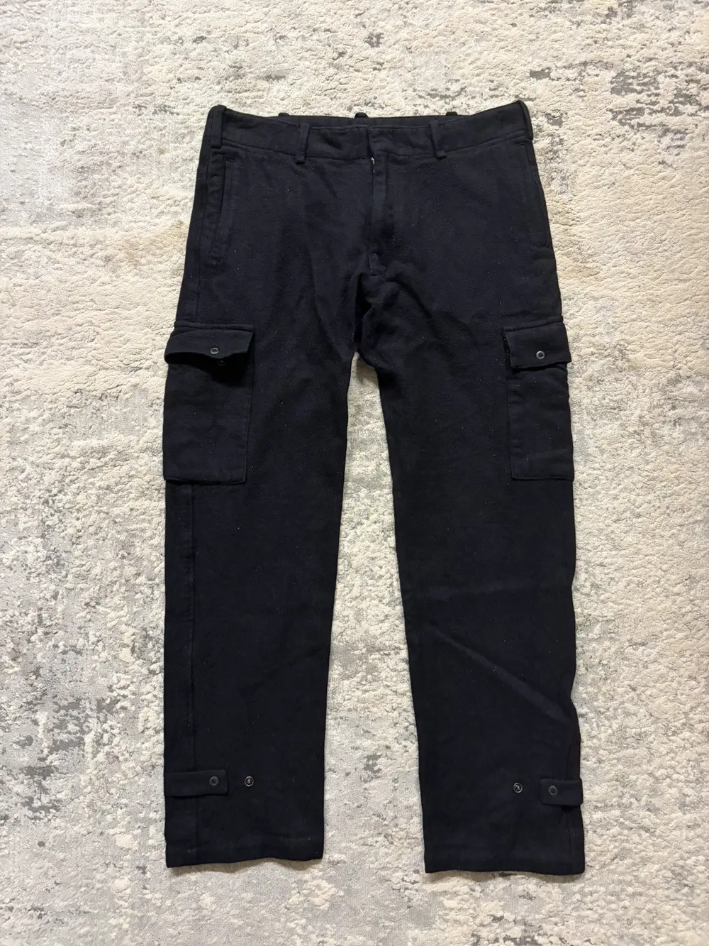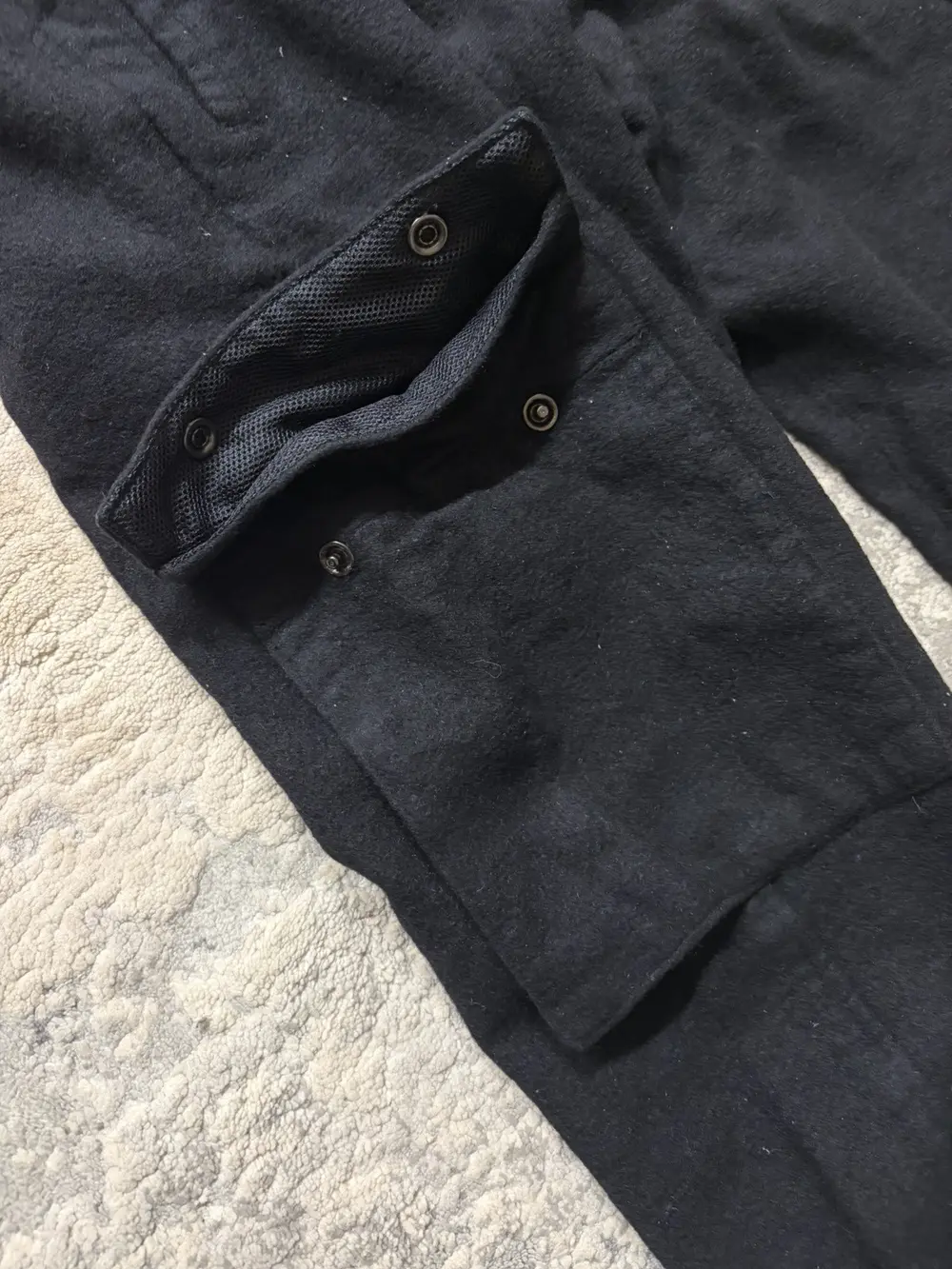 Undercover cropped wool/rayon pants featuring cargo pockets with mesh side paneling for airflow and contrast. Snap‑button closures appear throughout the design, and the adjustable leg openings let you shape the silhouette from straight to tapered. A utilitarian, tech‑leaning UC build with that signature hybrid construction.