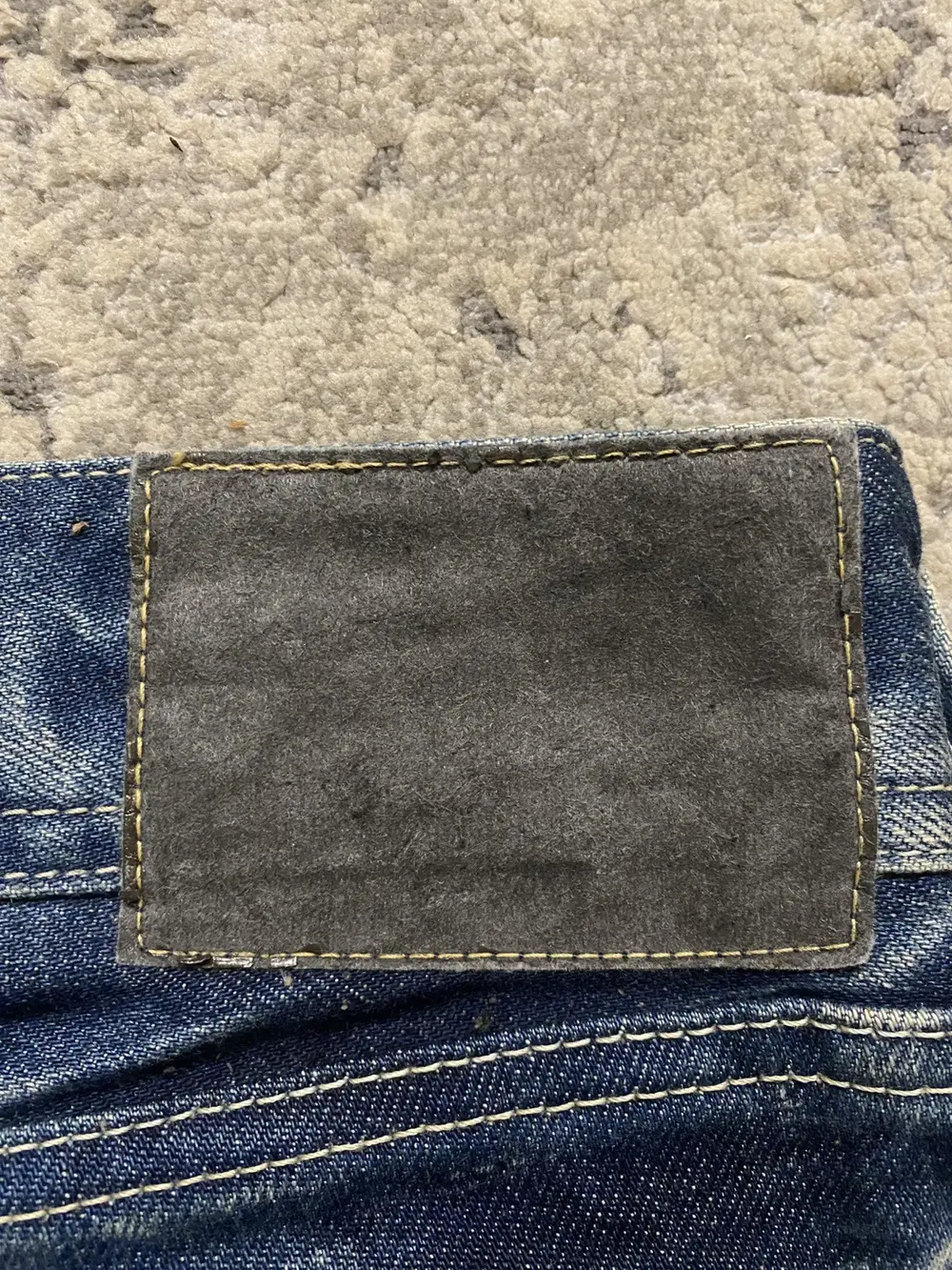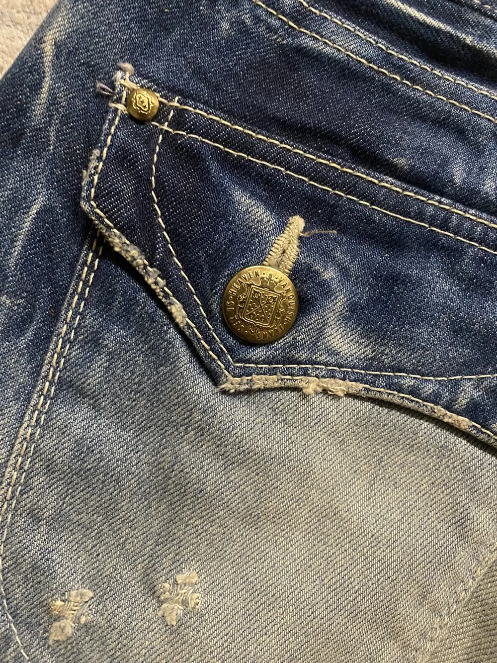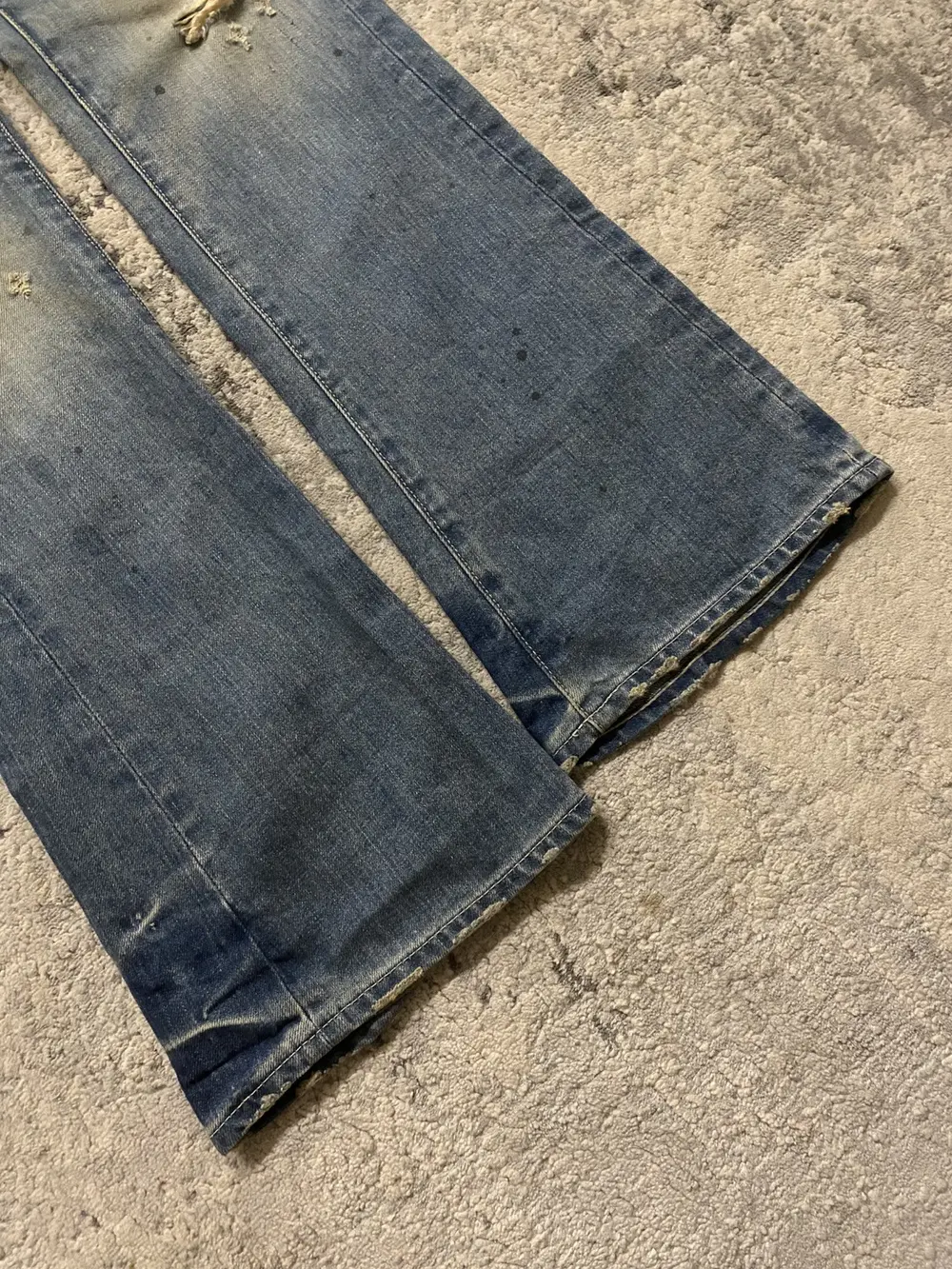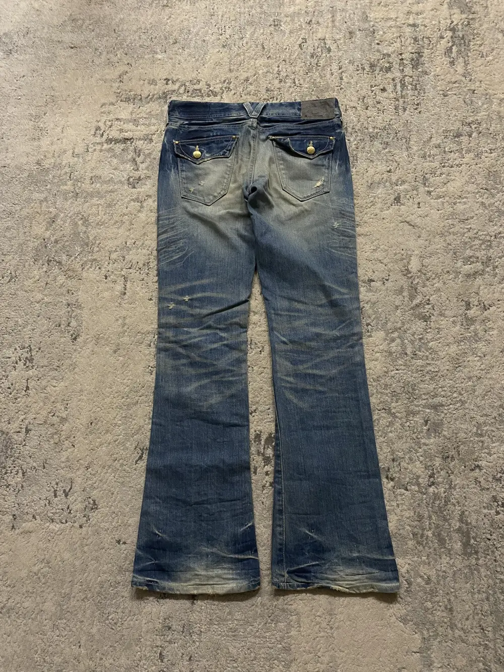 feature a sandy wash on navy blue denim with oil stains for a rugged, worn-in effect. Custom gold buttons and rivets add distinctive detailing, while subtle distressing enhances the aged look. The flared hems, finished with a heel bite, complete the silhouette with a touch of vintage-inspired character.