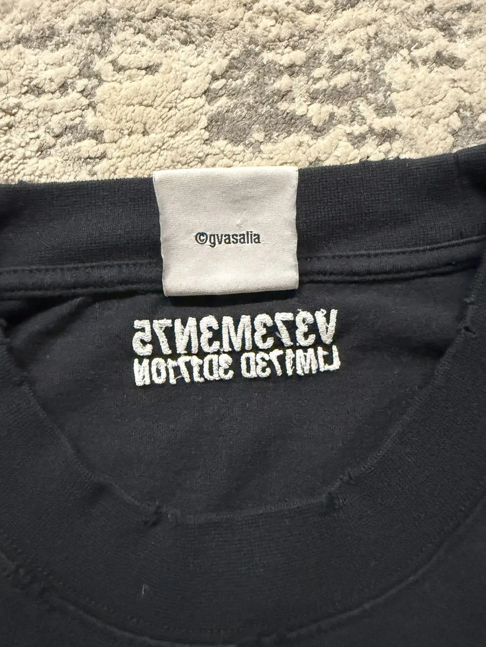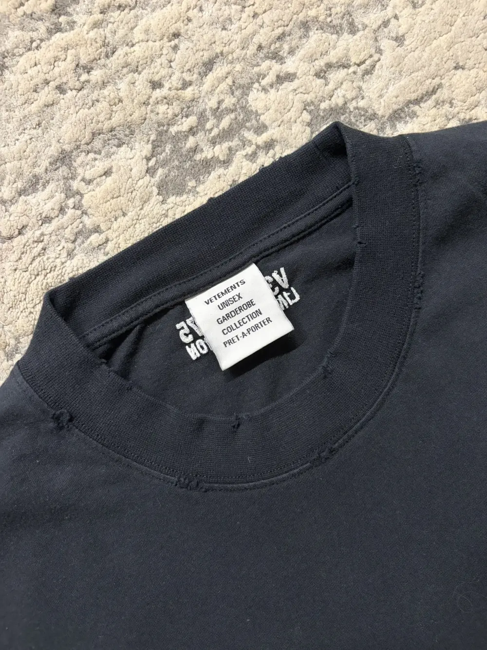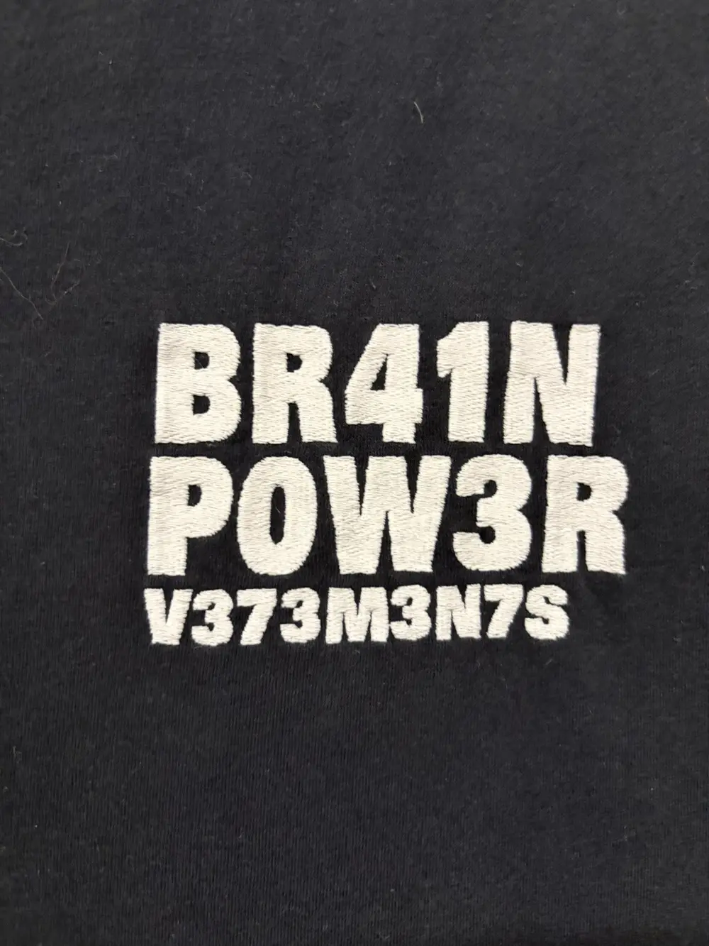 Vetements SS23 “Brain Power” T‑shirt in black, featuring the label’s signature oversized silhouette with a washed, worn‑in finish. Made from soft cotton jersey and detailed with embroidered “Brain Power” text at the chest and matching embroidered graphics at the back, giving it that elevated Vetements logo‑play feel. Designed with a ribbed crewneck, straight hem, and subtle distressing throughout, it captures the brand’s mix of irony, bold messaging, and luxury streetwear