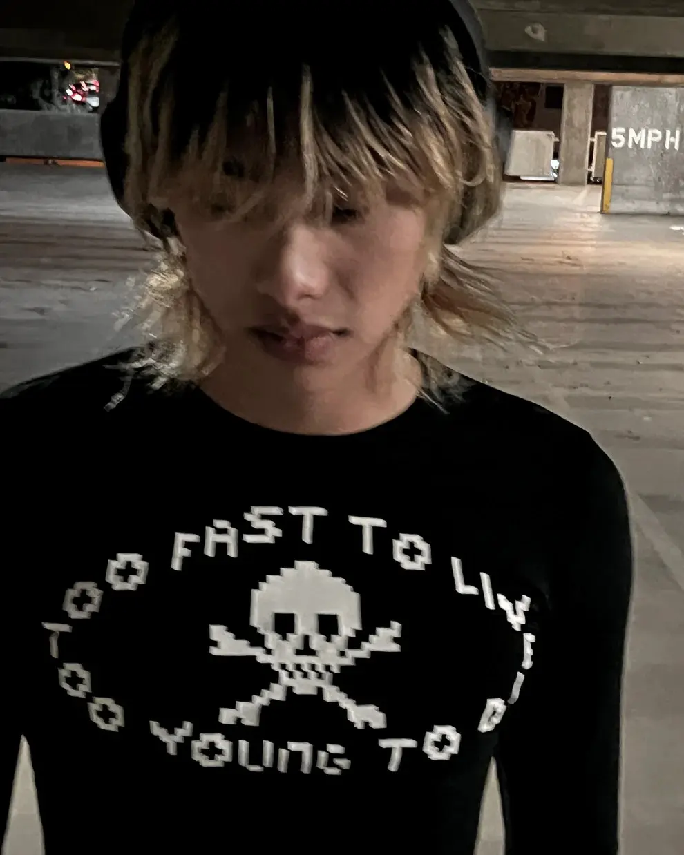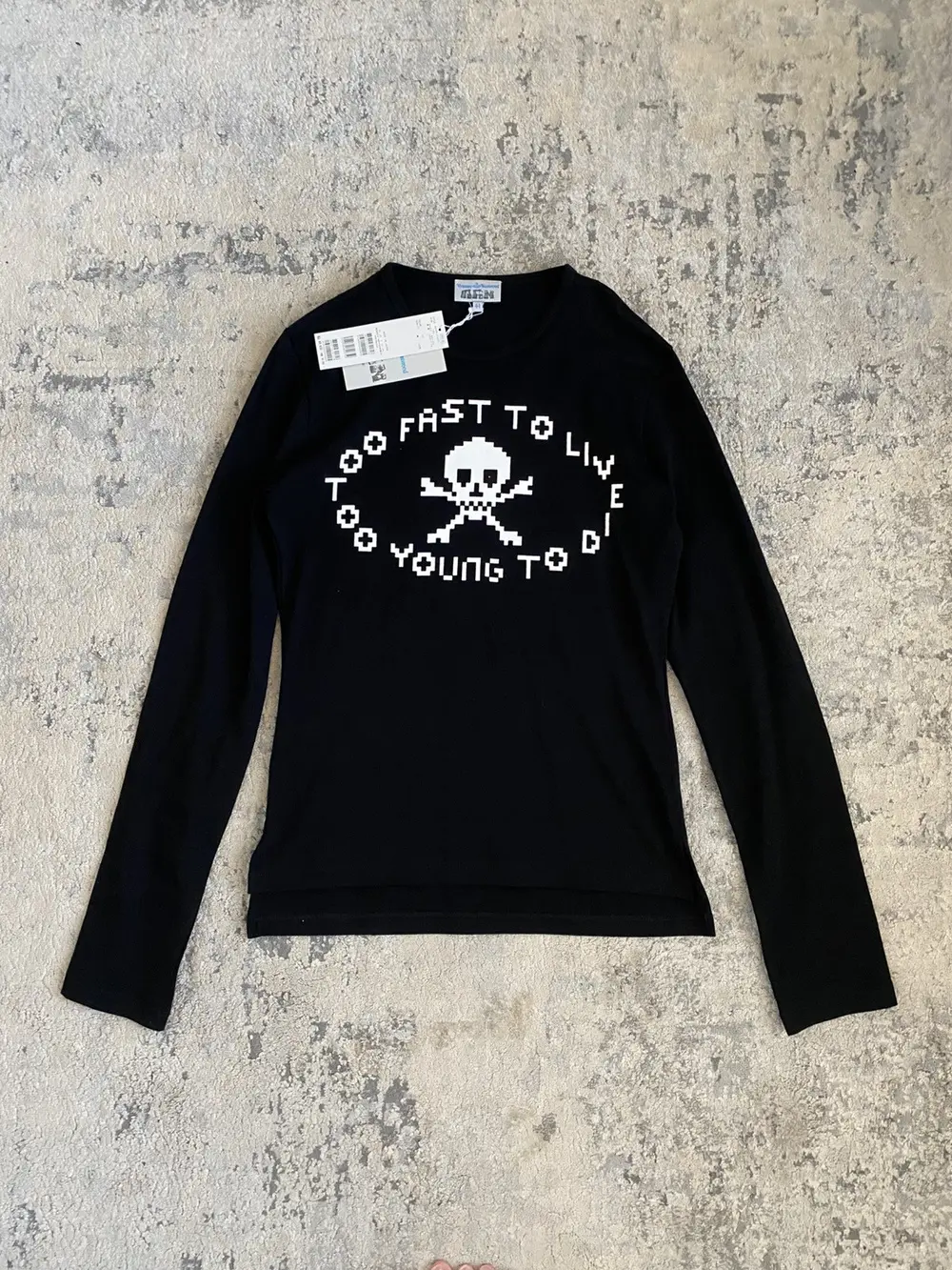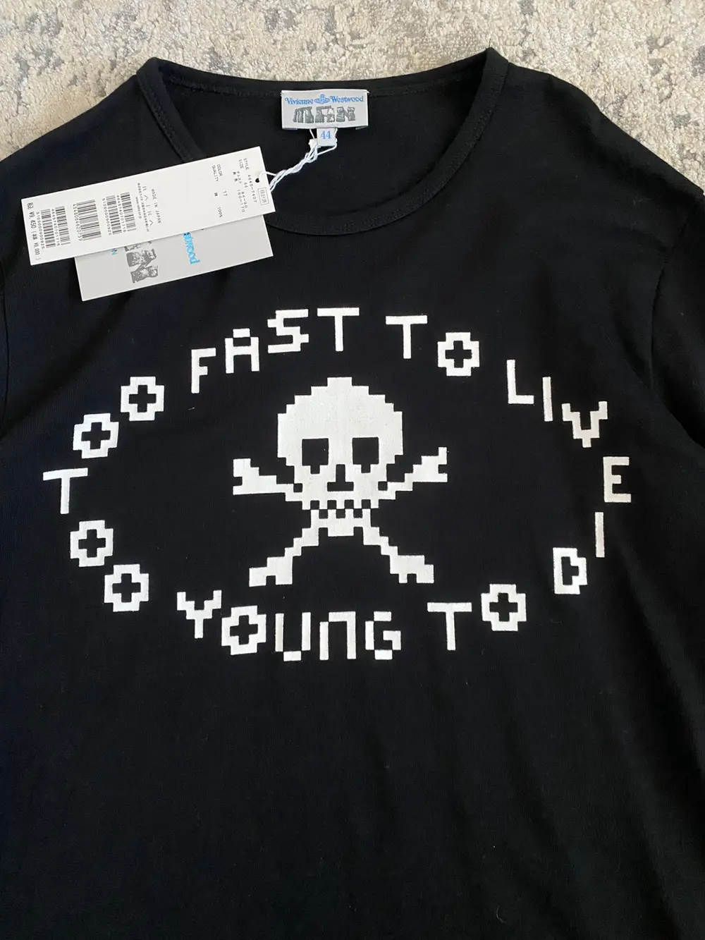 Vivienne Westwood’s iconic “Too Fast to Live, Too Young to Die” skull graphic in a digital art style. Split hems, Elongated sleeves, close to the body fit. New with tags.