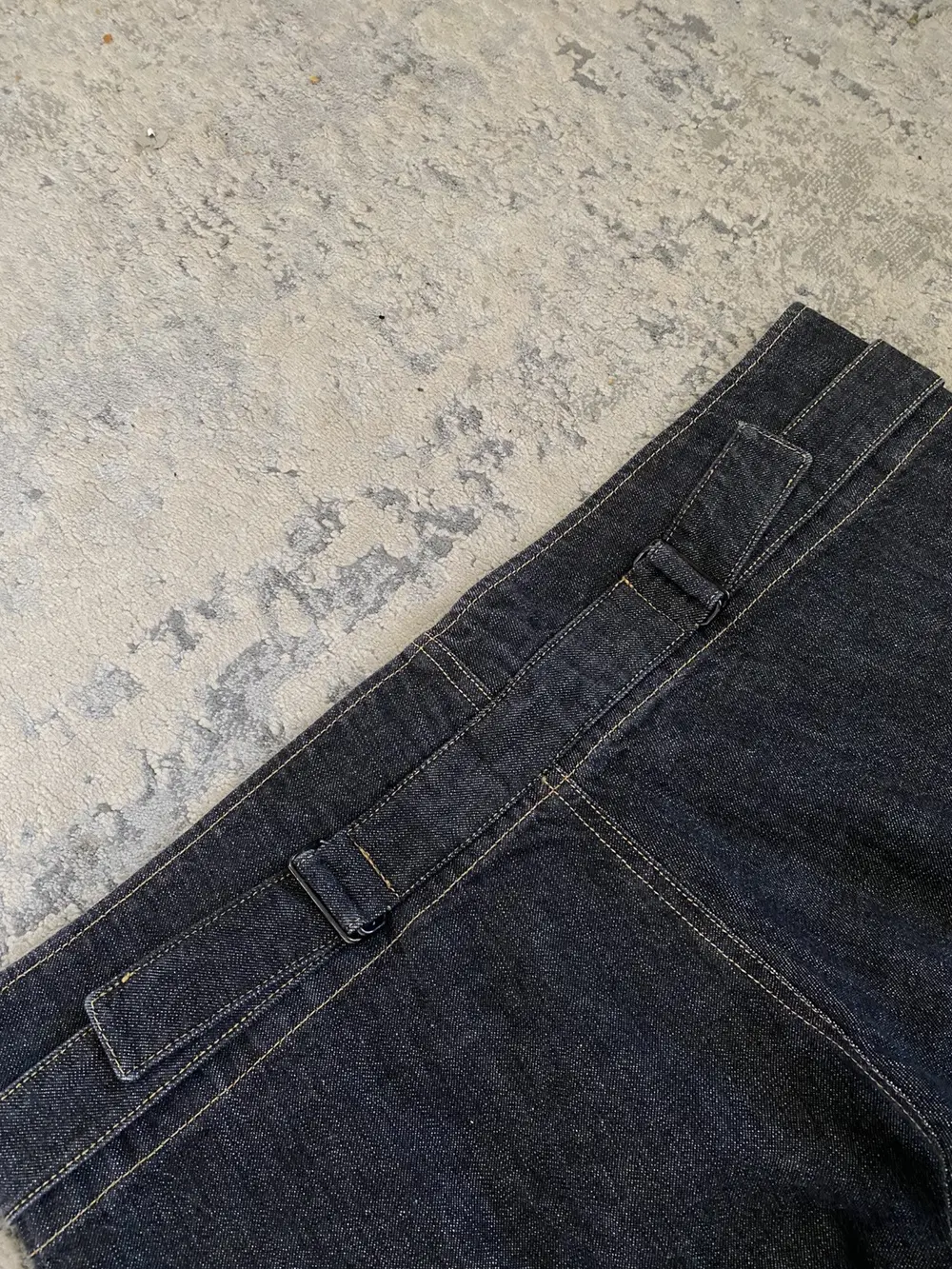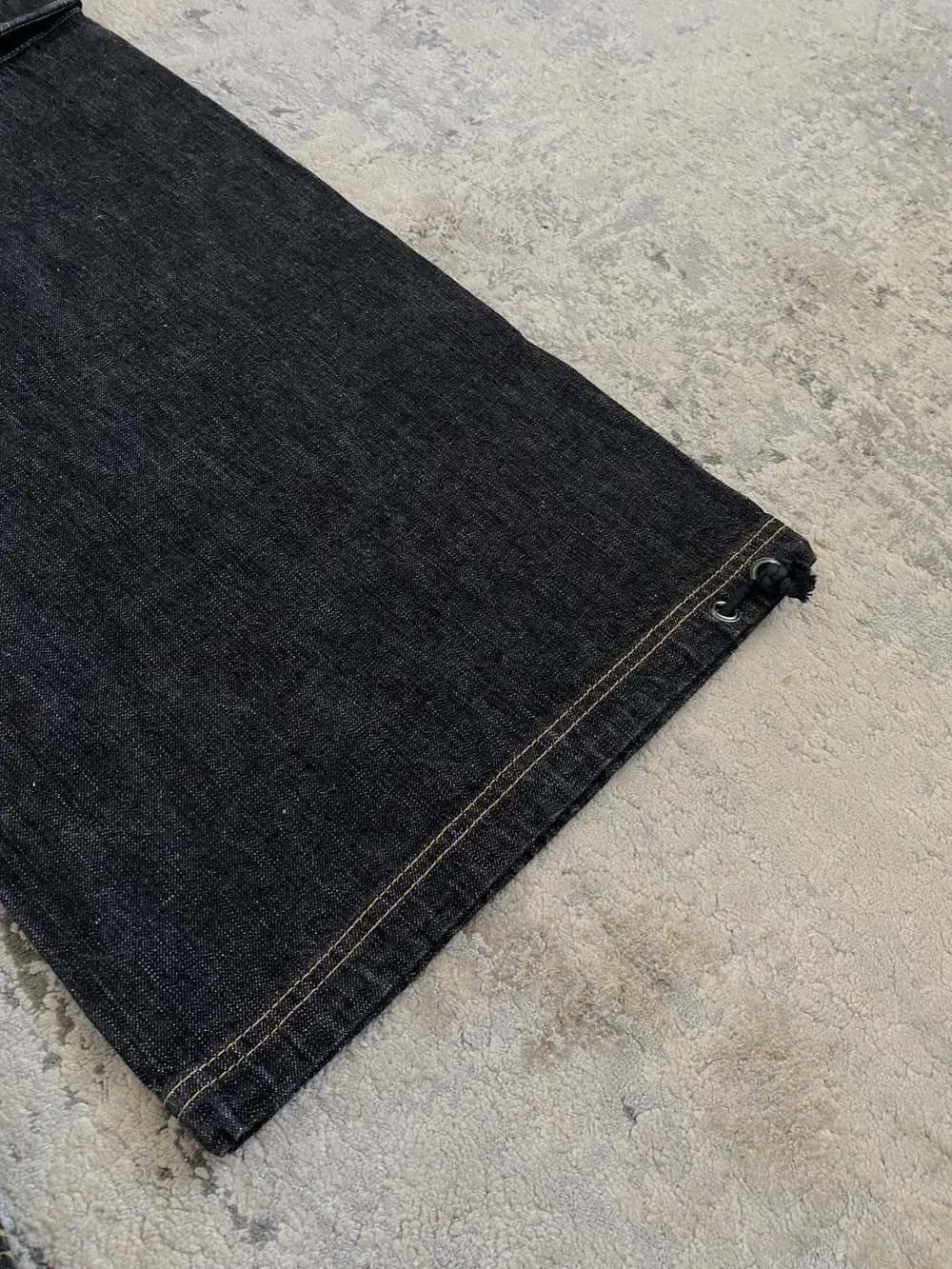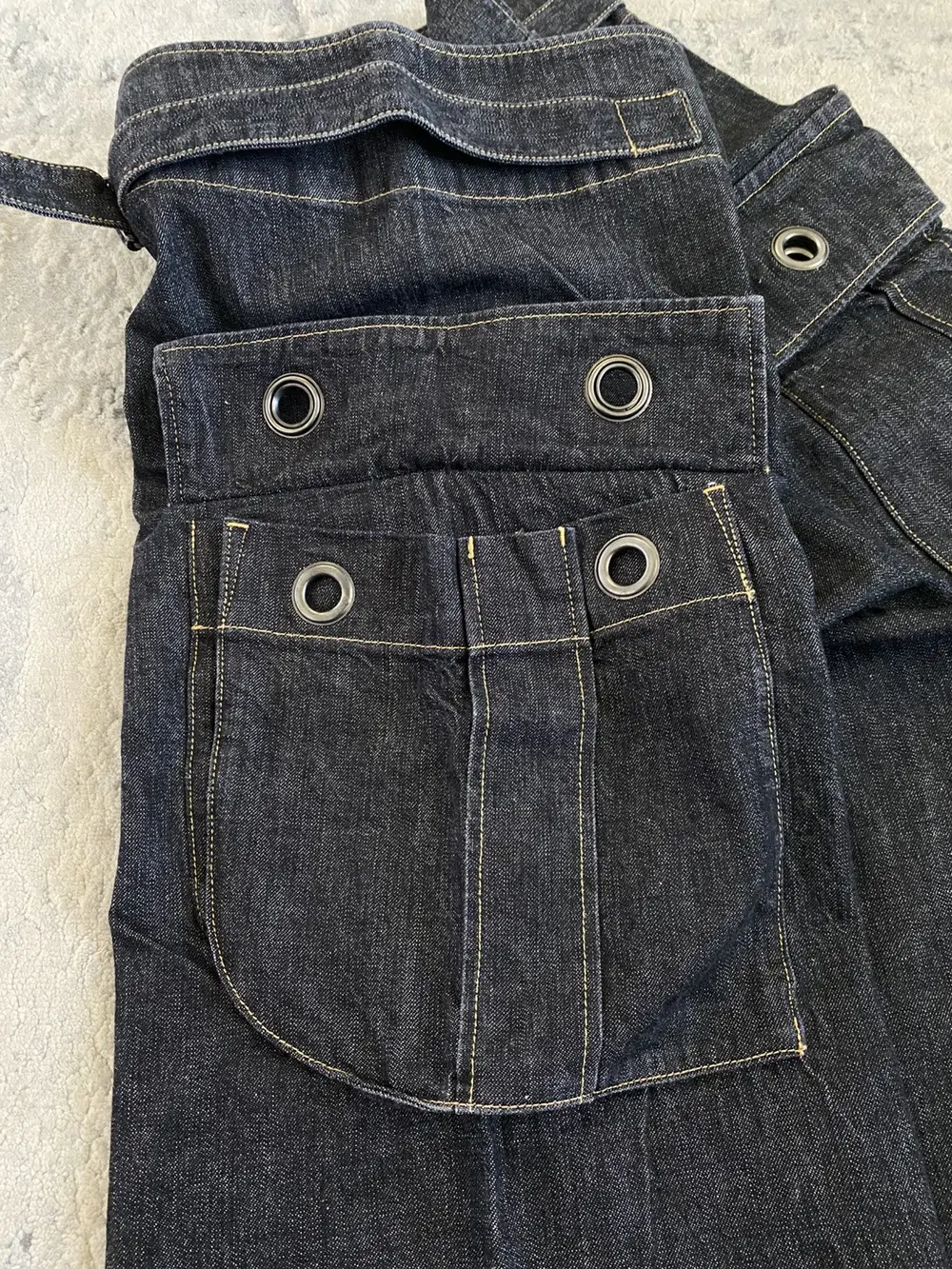 Cut from raw black denim with striking contrast yellow stitching, these Y’s jeans channel utilitarian elegance with a distinctly Yohji twist. The design features cargo pockets adorned with oversized ring hardware, a wraparound back cinch that extends from the front waistband, and drawstring hems for a customizable, tapered fit. A sculptural silhouette that balances industrial edge with refined construction—hallmarks of the Y’s philosophy.